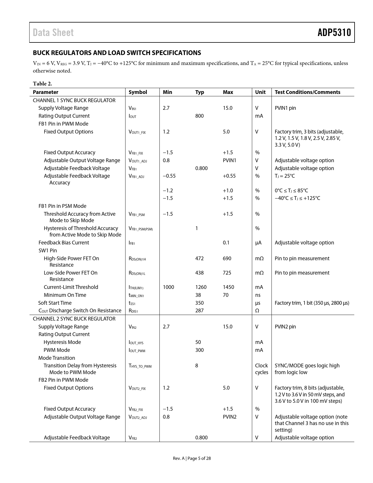 Data SheetADP5310BUCK REGULATORS AND LOAD SWITCH SPECIFICATIONS VIN = 6 V, VREG = 3.9 V, TJ = −40°C to +125°C for minimum and maximum specifications, and TA = 25°C for typical specifications, unless otherwise noted. Table 2. ParameterSymbolMinTypMaxUnitTest Conditions/Comments CHANNEL 1 SYNC BUCK REGULATOR Supply Voltage Range VIN1 2.7 15.0 V PVIN1 pin Rating Output Current IOUT 800 mA FB1 Pin in PWM Mode Fixed Output Options VOUT1_FIX 1.2 5.0 V Factory trim, 3 bits (adjustable, 1.2 V, 1.5 V, 1.8 V, 2.5 V, 2.85 V, 3.3 V, 5.0 V) Fixed Output Accuracy VFB1_FIX −1.5 +1.5 % Adjustable Output Voltage Range VOUT1_ADJ 0.8 PVIN1 V Adjustable voltage option Adjustable Feedback Voltage VFB1 0.800 V Adjustable voltage option Adjustable Feedback Voltage VFB1_ADJ −0.55 +0.55 % TJ = 25°C Accuracy −1.2 +1.0 % 0°C ≤ TJ ≤ 85°C −1.5 +1.5 % −40°C ≤ TJ ≤ +125°C FB1 Pin in PSM Mode Threshold Accuracy from Active VFB1_PSM −1.5 +1.5 % Mode to Skip Mode Hysteresis of Threshold Accuracy VFB1_PSM(PSM) 1 % from Active Mode to Skip Mode Feedback Bias Current IFB1 0.1 µA Adjustable voltage option SW1 Pin High-Side Power FET On RDS(ON)1H 472 690 mΩ Pin to pin measurement Resistance Low-Side Power FET On RDS(ON)1L 438 725 mΩ Pin to pin measurement Resistance Current-Limit Threshold ITH(ILIM1) 1000 1260 1450 mA Minimum On Time tMIN_ON1 38 70 ns Soft Start Time tSS1 350 µs Factory trim, 1 bit (350 µs, 2800 µs) COUT Discharge Switch On Resistance RDIS1 287 Ω CHANNEL 2 SYNC BUCK REGULATOR Supply Voltage Range VIN2 2.7 15.0 V PVIN2 pin Rating Output Current Hysteresis Mode IOUT_HYS 50 mA PWM Mode IOUT_PWM 300 mA Mode Transition Transition Delay from Hysteresis THYS_TO_PWM 8 Clock SYNC/MODE goes logic high Mode to PWM Mode cycles from logic low FB2 Pin in PWM Mode Fixed Output Options VOUT2_FIX 1.2 5.0 V Factory trim, 8 bits (adjustable, 1.2 V to 3.6 V in 50 mV steps, and 3.6 V to 5.0 V in 100 mV steps) Fixed Output Accuracy VFB2_FIX −1.5 +1.5 % Adjustable Output Voltage Range VOUT2_ADJ 0.8 PVIN2 V Adjustable voltage option (note that Channel 3 has no use in this setting) Adjustable Feedback Voltage VFB2 0.800 V Adjustable voltage option Rev. A | Page 5 of 28 Document Outline FEATURES APPLICATIONS TYPICAL APPLICATION CIRCUIT GENERAL DESCRIPTION TABLE OF CONTENTS REVISION HISTORY DETAILED FUNCTIONAL BLOCK DIAGRAM SPECIFICATIONS BUCK REGULATORS AND LOAD SWITCH SPECIFICATIONS ABSOLUTE MAXIMUM RATINGS THERMAL RESISTANCE ESD CAUTION PIN CONFIGURATION AND FUNCTION DESCRIPTIONS TYPICAL PERFORMANCE CHARACTERISTICS THEORY OF OPERATION BUCK REGULATOR OPERATION MODES PWM Mode PSM Mode Hysteresis Mode Mode Selection ADJUSTABLE AND FIXED OUTPUT VOLTAGES UNDERVOLTAGE LOCKOUT (UVLO) ENABLE AND SHUTDOWN FEATURES INTERNAL LINEAR REGULATOR (VREG) OSCILLATOR AND SYNCHRONIZATION CURRENT LIMIT SHORT-CIRCUIT PROTECTION SOFT START STARTUP WITH PRECHARGED OUTPUT 100% DUTY OPERATION ACTIVE DISCHARGE POWER-GOOD FUNCTION LOAD SWITCH THERMAL SHUTDOWN APPLICATIONS INFORMATION EXTERNAL COMPONENT SELECTION SELECTING THE INDUCTOR OUTPUT CAPACITOR INPUT CAPACITOR ADJUSTABLE OUTPUT VOLTAGE PROGRAMMING EFFICIENCY Power Switch Conduction Losses Inductor Losses Driver Losses Transition Losses RECOMMENDED BUCK EXTERNAL COMPONENTS CAPACITOR SELECTION Output Capacitor Input Bypass Capacitor Input and Output Capacitor Properties CIRCUIT BOARD LAYOUT RECOMMENDATIONS TYPICAL APPLICATION CIRCUITS FACTORY PROGRAMMABLE OPTIONS OUTLINE DIMENSIONS ORDERING GUIDE
