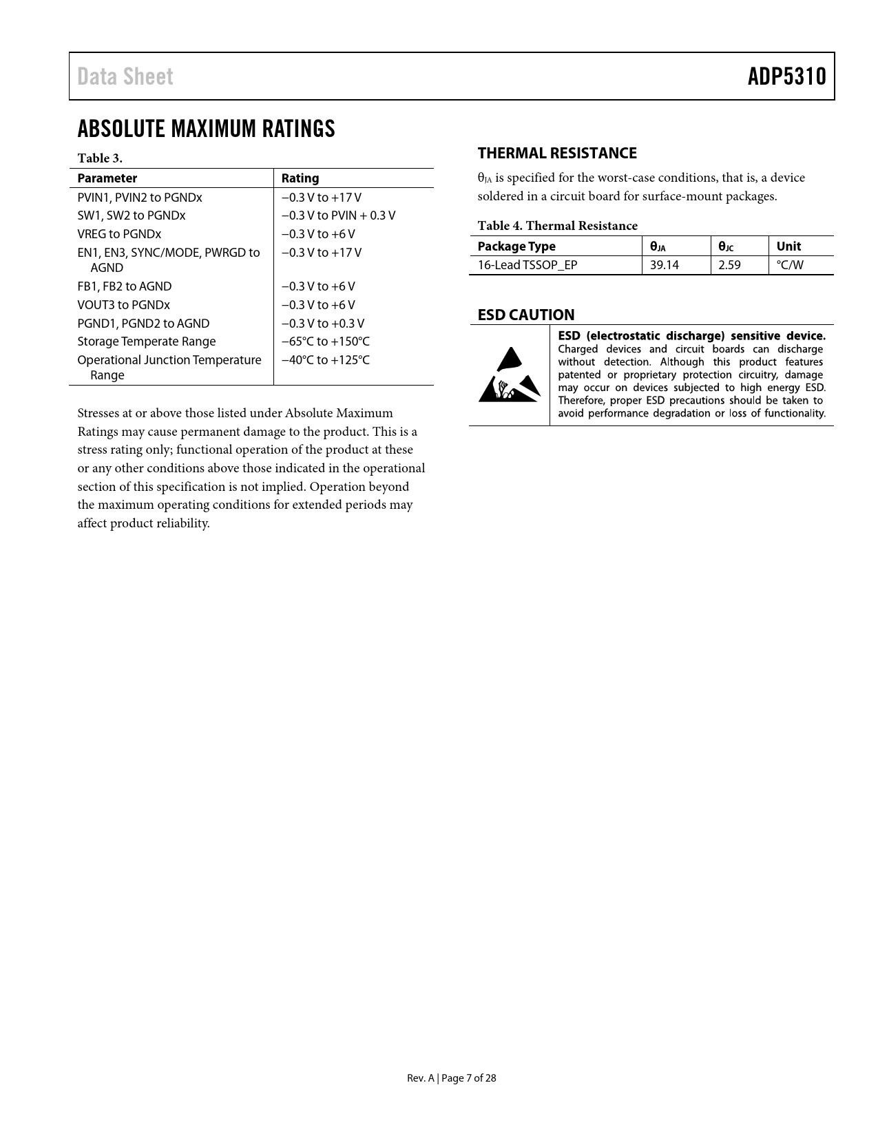 Seiten / Seite28 / 7 — Data Sheet. ADP5310. ABSOLUTE MAXIMUM RATINGS Table 3. THERMAL …