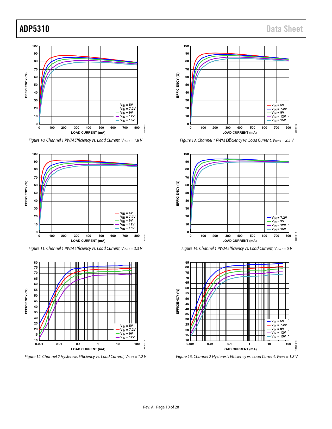ADP5310. Data Sheet. 100. NCY. ICI. VIN = 5V. IN = 7.2V. VIN = 7.2V. VIN = 9V. VIN = 12V. VIN = 15V. 200. 300. 400. 500. 600. 700. 800. LOAD CURRENT (mA)