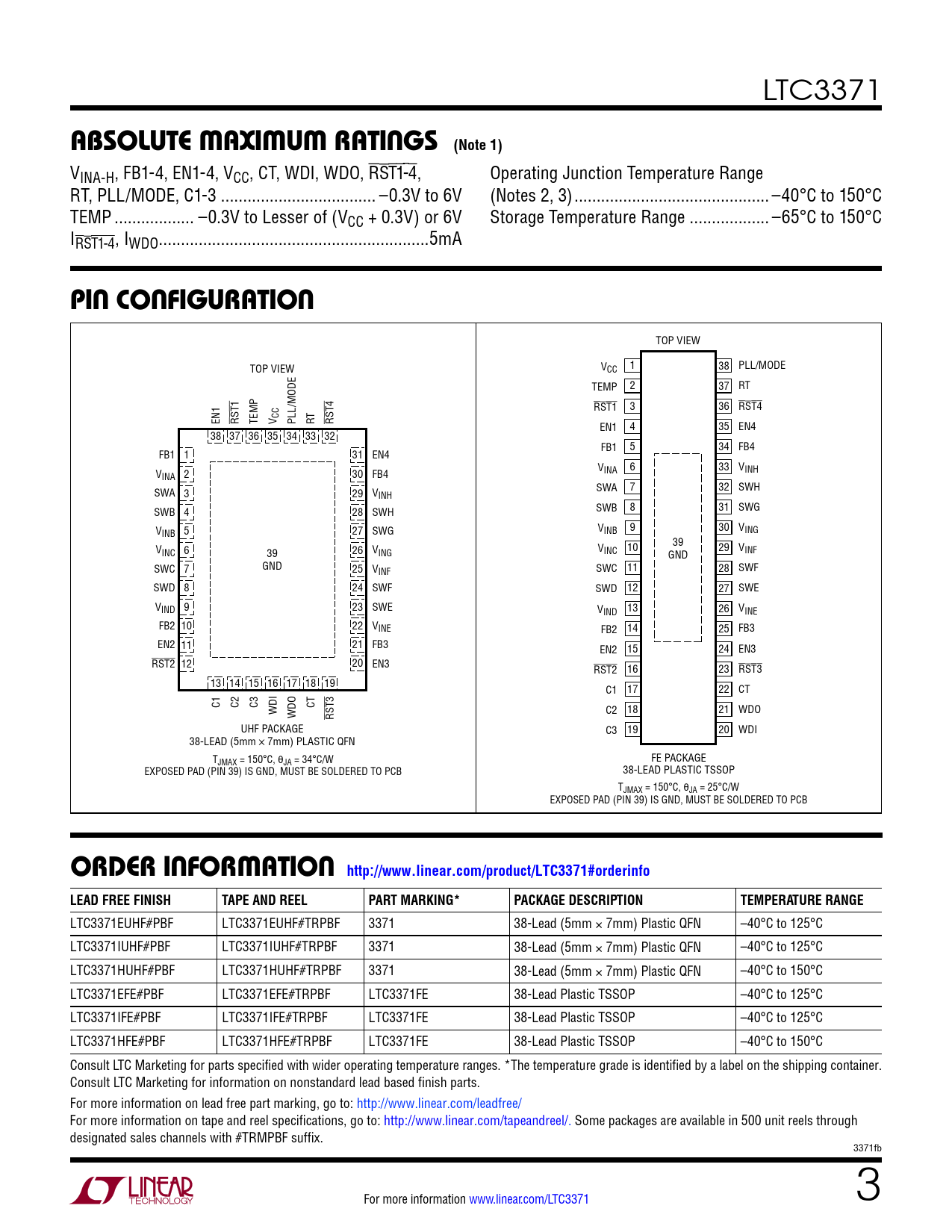 LTC3371 ABSOLUTE MAXIMUM RATINGS (Note 1) VINA-H, FB1-4, EN1-4, VCC, CT, WDI, WDO, RST1-4, Operating Junction Temperature Range RT, PLL/MODE, C1-3 ... –0.3V to 6V (Notes 2, 3) .. –40°C to 150°C TEMP .. –0.3V to Lesser of (VCC + 0.3V) or 6V Storage Temperature Range .. –65°C to 150°C IRST1-4, IWDO ...5mA PIN CONFIGURATION TOP VIEW TOP VIEW V 1 38 CC PLL/MODE TEMP 2 37 RT RST1 3 36 RST4 EN1 RST1 TEMP V CC PLL/MODE RT RST4 EN1 4 35 EN4 38 37 36 35 34 33 32 FB1 5 34 FB4 FB1 1 31 EN4 V 6 33 V V INA INH INA 2 30 FB4 SWA 3 29 V SWA 7 32 SWH INH SWB 4 28 SWH SWB 8 31 SWG V V 9 30 V INB 5 27 SWG INB ING 39 VINC 6 39 26 VING V 10 29 INC VINF GND GND SWC 7 25 VINF SWC 11 28 SWF SWD 8 24 SWF SWD 12 27 SWE VIND 9 23 SWE V 13 26 IND VINE FB2 10 22 VINE FB2 14 25 FB3 EN2 11 21 FB3 EN2 15 24 EN3 RST2 12 20 EN3 RST2 16 23 RST3 13 14 15 16 17 18 19 C1 17 22 CT C1 C2 C3 CT WDI WDO C2 18 WDO RST3 21 UHF PACKAGE C3 19 20 WDI 38-LEAD (5mm × 7mm) PLASTIC QFN TJMAX = 150°C, θJA = 34°C/W FE PACKAGE EXPOSED PAD (PIN 39) IS GND, MUST BE SOLDERED TO PCB 38-LEAD PLASTIC TSSOP TJMAX = 150°C, θJA = 25°C/W EXPOSED PAD (PIN 39) IS GND, MUST BE SOLDERED TO PCB ORDER INFORMATION http://www.linear.com/product/LTC3371#orderinfoLEAD FREE FINISHTAPE AND REELPART MARKING*PACKAGE DESCRIPTIONTEMPERATURE RANGE LTC3371EUHF#PBF LTC3371EUHF#TRPBF 3371 38-Lead (5mm × 7mm) Plastic QFN –40°C to 125°C LTC3371IUHF#PBF LTC3371IUHF#TRPBF 3371 38-Lead (5mm × 7mm) Plastic QFN –40°C to 125°C LTC3371HUHF#PBF LTC3371HUHF#TRPBF 3371 38-Lead (5mm × 7mm) Plastic QFN –40°C to 150°C LTC3371EFE#PBF LTC3371EFE#TRPBF LTC3371FE 38-Lead Plastic TSSOP –40°C to 125°C LTC3371IFE#PBF LTC3371IFE#TRPBF LTC3371FE 38-Lead Plastic TSSOP –40°C to 125°C LTC3371HFE#PBF LTC3371HFE#TRPBF LTC3371FE 38-Lead Plastic TSSOP –40°C to 150°C Consult LTC Marketing for parts specified with wider operating temperature ranges. *The temperature grade is identified by a label on the shipping container. Consult LTC Marketing for information on nonstandard lead based finish parts. For more information on lead free part marking, go to: http://www.linear.com/leadfree/ For more information on tape and reel specifications, go to: http://www.linear.com/tapeandreel/. Some packages are available in 500 unit reels through designated sales channels with #TRMPBF suffix. 3371fb For more information www.linear.com/LTC3371 3 Document Outline Features Applications Typical Application Description Absolute Maximum Ratings Pin Configuration Order Information Electrical Characteristics Typical Performance Characteristics Pin Functions Block Diagram Operation Buck Switching Regulators Buck Regulators with Combined Power Stages Power Failure Reporting Via RST Pins Temperature Monitoring and Overtemperature Protection Programming the Operating Frequency Windowed Watchdog Timer Choosing the CT Capacitor Applications Information Buck Switching Regulator Output Voltage and Feedback Network Buck Regulators Combined Buck Power Stages Input and Output Decoupling Capacitor Selection PCB Considerations Typical Applications Package Description Revision History Typical Application Related Parts