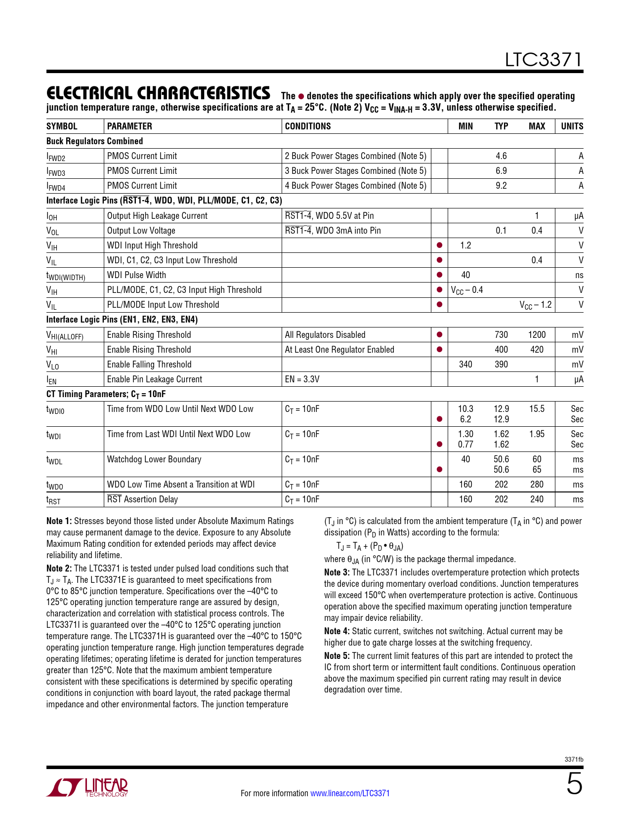 The current limit features of this part are intended to protect the greater than 125°C. Note that the maximum ambient temperature IC from short term or intermittent fault conditions. Continuous operation consistent with these specifications is determined by specific operating above the maximum specified pin current rating may result in device conditions in conjunction with board layout, the rated package thermal degradation over time. impedance and other environmental factors. The junction temperature 3371fb For more information www.linear.com/LTC3371 5 Document Outline Features Applications Typical Application Description Absolute Maximum Ratings Pin Configuration Order Information Electrical Characteristics Typical Performance Characteristics Pin Functions Block Diagram Operation Buck Switching Regulators Buck Regulators with Combined Power Stages Power Failure Reporting Via RST Pins Temperature Monitoring and Overtemperature Protection Programming the Operating Frequency Windowed Watchdog Timer Choosing the CT Capacitor Applications Information Buck Switching Regulator Output Voltage and Feedback Network Buck Regulators Combined Buck Power Stages Input and Output Decoupling Capacitor Selection PCB Considerations Typical Applications Package Description Revision History Typical Application Related Parts