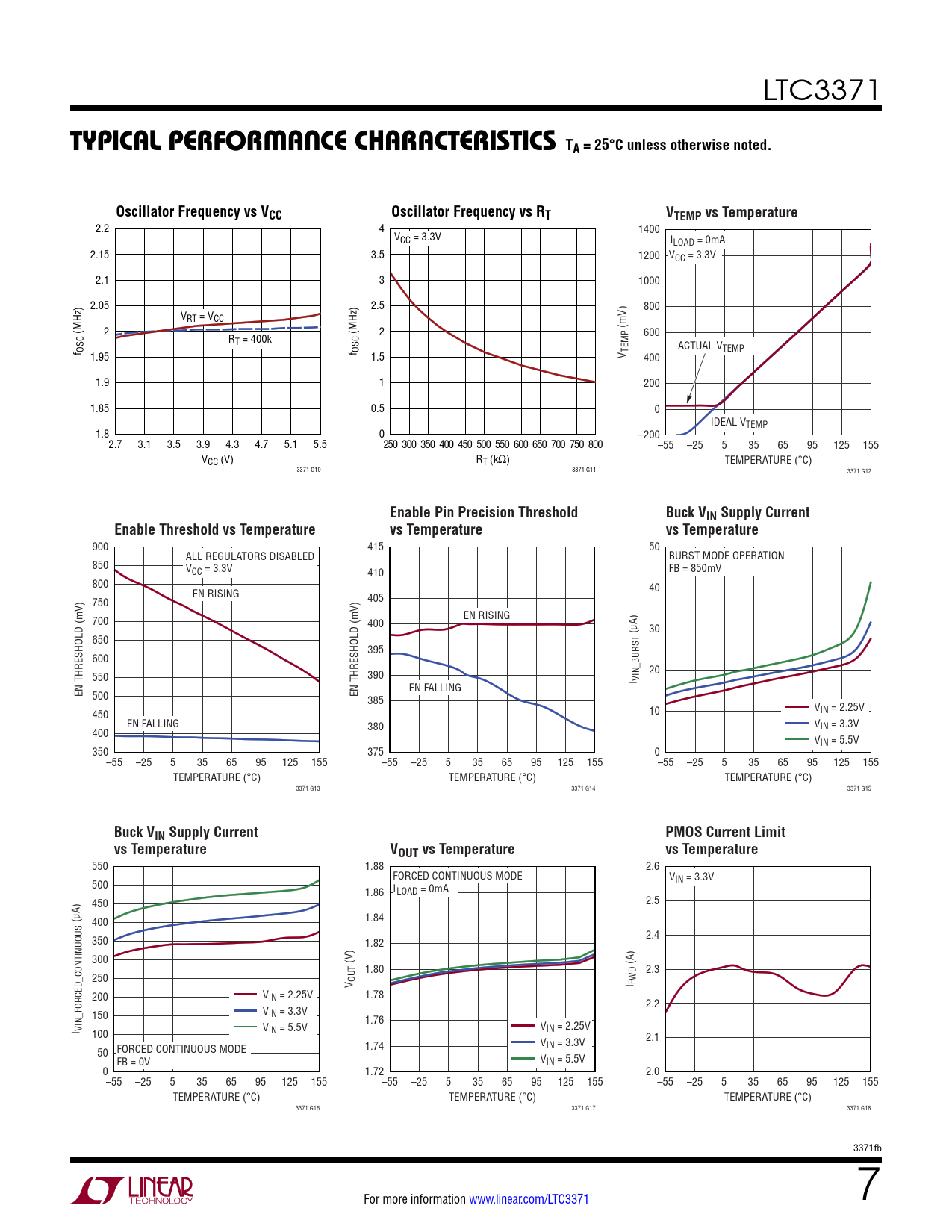 2.2 4 1400 VCC = 3.3V ILOAD = 0mA 2.15 3.5 1200 VCC = 3.3V 2.1 3 1000 2.05 2.5 800 VRT = VCC (MHz) 2 (MHz) 2 (mV) 600 RT = 400k f OSC ACTUAL VTEMP 1.95 f OSC 1.5 V TEMP 400 1.9 1 200 1.85 0.5 0 IDEAL VTEMP 1.8 0 –200 2.7 3.1 3.5 3.9 4.3 4.7 5.1 5.5 250 300 350 400 450 500 550 600 650 700 750 800 –55 –25 5 35 65 95 125 155 VCC (V) RT (kΩ) TEMPERATURE (°C) 3371 G10 3371 G11 3371 G12