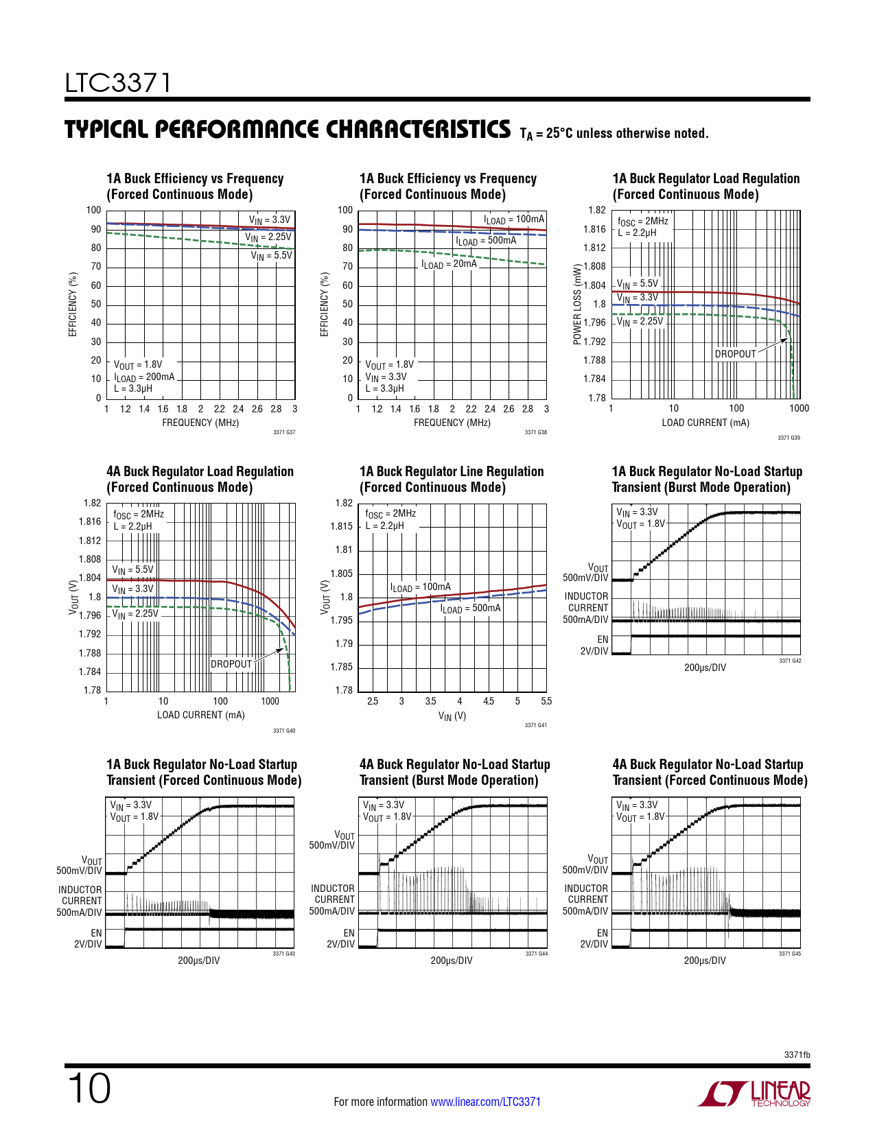 1.82 1.82 f f VIN = 3.3V 1.816 OSC = 2MHz OSC = 2MHz L = 2.2µH 1.815 L = 2.2µH VOUT = 1.8V 1.812 1.81 1.808 V VOUT 1.804 IN = 5.5V 1.805 500mV/DIV (V) V ILOAD = 100mA 1.8 IN = 3.3V (V) 1.8 INDUCTOR V OUT I CURRENT 1.796 V LOAD = 500mA IN = 2.25V V OUT1.795 500mA/DIV 1.792 1.79 EN 1.788 2V/DIV DROPOUT 3371 G42 1.784 1.785 200µs/DIV 1.78 1.78 1 10 100 1000 2.5 3 3.5 4 4.5 5 5.5 LOAD CURRENT (mA) VIN (V) 3371 G41 3371 G40