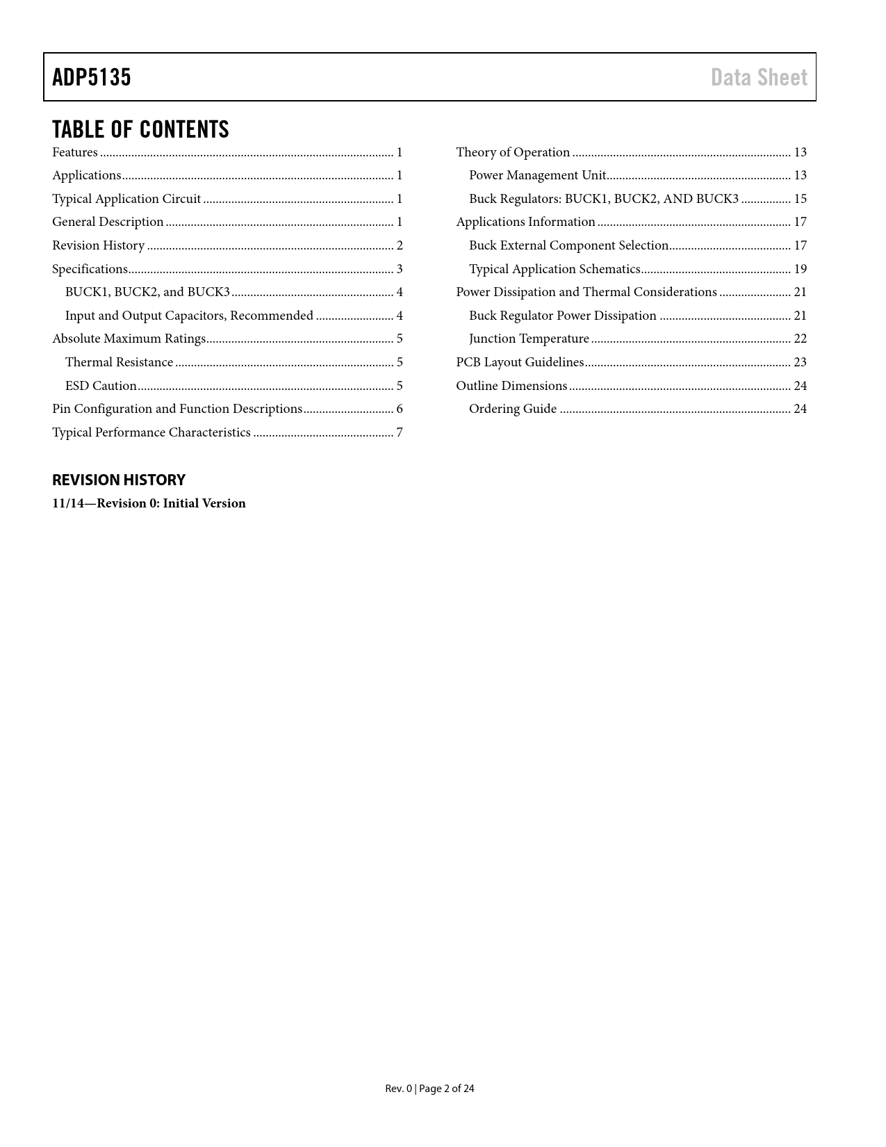 link to page 1 link to page 1 link to page 1 link to page 1 link to page 2 link to page 3 link to page 4 link to page 4 link to page 5 link to page 5 link to page 5 link to page 6 link to page 7 link to page 13 link to page 13 link to page 15 link to page 17 link to page 17 link to page 21 link to page 21 link to page 22 link to page 23 link to page 19 link to page 24 link to page 24 ADP5135Data SheetTABLE OF CONTENTS Features .. 1 Theory of Operation .. 13 Applications ... 1 Power Management Unit ... 13 Typical Application Circuit ... 1 Buck Regulators: BUCK1, BUCK2, AND BUCK3 .. 15 General Description ... 1 Applications Information .. 17 Revision History ... 2 Buck External Component Selection ... 17 Specifications ... 3 Typical Application Schematics .. 19 BUCK1, BUCK2, and BUCK3 .. 4 Power Dissipation and Thermal Considerations ... 21 Input and Output Capacitors, Recommended ... 4 Buck Regulator Power Dissipation .. 21 Absolute Maximum Ratings .. 5 Junction Temperature .. 22 Thermal Resistance .. 5 PCB Layout Guidelines .. 23 ESD Caution .. 5 Outline Dimensions ... 24 Pin Configuration and Function Descriptions ... 6 Ordering Guide .. 24 Typical Performance Characteristics ... 7 REVISION HISTORY11/14—Revision 0: Initial Version Rev. 0 | Page 2 of 24 Document Outline Features Applications Typical Application Circuit General Description Revision History Specifications BUCK1, BUCK2, and BUCK3 Input and Output Capacitors, Recommended Absolute Maximum Ratings Thermal Resistance ESD Caution Pin Configuration and Function Descriptions Typical Performance Characteristics Theory of Operation Power Management Unit Power-Good Output Thermal Protection Undervoltage Lockout Precision Enable and Shutdown Control Buck Regulators: BUCK1, BUCK2, AND BUCK3 Control Scheme PWM Mode Power Save Mode (PSM) PSM Current Threshold Oscillator/Phasing of Inductor Switching Short-Circuit Protection Buck Regulator Soft Start Current Limit 100% Duty Operation Active Pull-Down Resistors Applications Information Buck External Component Selection Feedback Resistors Inductor Output Capacitor Input Capacitor Typical Application Schematics Power Dissipation and Thermal Considerations Buck Regulator Power Dissipation Junction Temperature PCB Layout Guidelines Outline Dimensions Ordering Guide