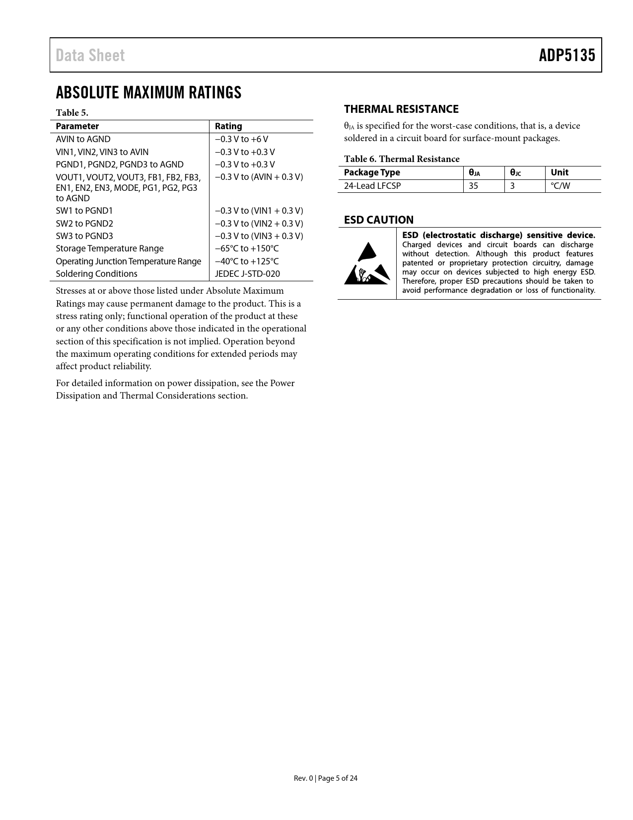 link to page 21 link to page 21 Data SheetADP5135ABSOLUTE MAXIMUM RATINGS Table 5.THERMAL RESISTANCEParameter Rating θJA is specified for the worst-case conditions, that is, a device AVIN to AGND −0.3 V to +6 V soldered in a circuit board for surface-mount packages. VIN1, VIN2, VIN3 to AVIN −0.3 V to +0.3 V Table 6. Thermal Resistance PGND1, PGND2, PGND3 to AGND −0.3 V to +0.3 V Package Typeθ VOUT1, VOUT2, VOUT3, FB1, FB2, FB3, −0.3 V to (AVIN + 0.3 V) JAθJCUnit EN1, EN2, EN3, MODE, PG1, PG2, PG3 24-Lead LFCSP 35 3 °C/W to AGND SW1 to PGND1 −0.3 V to (VIN1 + 0.3 V) SW2 to PGND2 −0.3 V to (VIN2 + 0.3 V) ESD CAUTION SW3 to PGND3 −0.3 V to (VIN3 + 0.3 V) Storage Temperature Range −65°C to +150°C Operating Junction Temperature Range −40°C to +125°C Soldering Conditions JEDEC J-STD-020 Stresses at or above those listed under Absolute Maximum Ratings may cause permanent damage to the product. This is a stress rating only; functional operation of the product at these or any other conditions above those indicated in the operational section of this specification is not implied. Operation beyond the maximum operating conditions for extended periods may affect product reliability. For detailed information on power dissipation, see the Power Dissipation and Thermal Considerations section. Rev. 0 | Page 5 of 24 Document Outline Features Applications Typical Application Circuit General Description Revision History Specifications BUCK1, BUCK2, and BUCK3 Input and Output Capacitors, Recommended Absolute Maximum Ratings Thermal Resistance ESD Caution Pin Configuration and Function Descriptions Typical Performance Characteristics Theory of Operation Power Management Unit Power-Good Output Thermal Protection Undervoltage Lockout Precision Enable and Shutdown Control Buck Regulators: BUCK1, BUCK2, AND BUCK3 Control Scheme PWM Mode Power Save Mode (PSM) PSM Current Threshold Oscillator/Phasing of Inductor Switching Short-Circuit Protection Buck Regulator Soft Start Current Limit 100% Duty Operation Active Pull-Down Resistors Applications Information Buck External Component Selection Feedback Resistors Inductor Output Capacitor Input Capacitor Typical Application Schematics Power Dissipation and Thermal Considerations Buck Regulator Power Dissipation Junction Temperature PCB Layout Guidelines Outline Dimensions Ordering Guide
