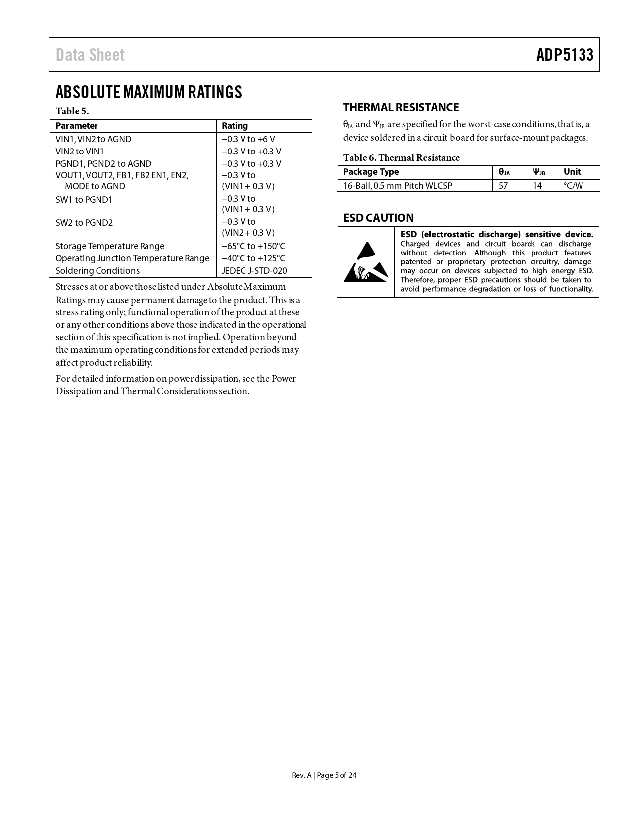 Data Sheet ADP5133 ABSOLUTE MAXIMUM RATINGS Table 5 THERMAL RESISTANCE Parameter Rating Table 6 Thermal Resistance