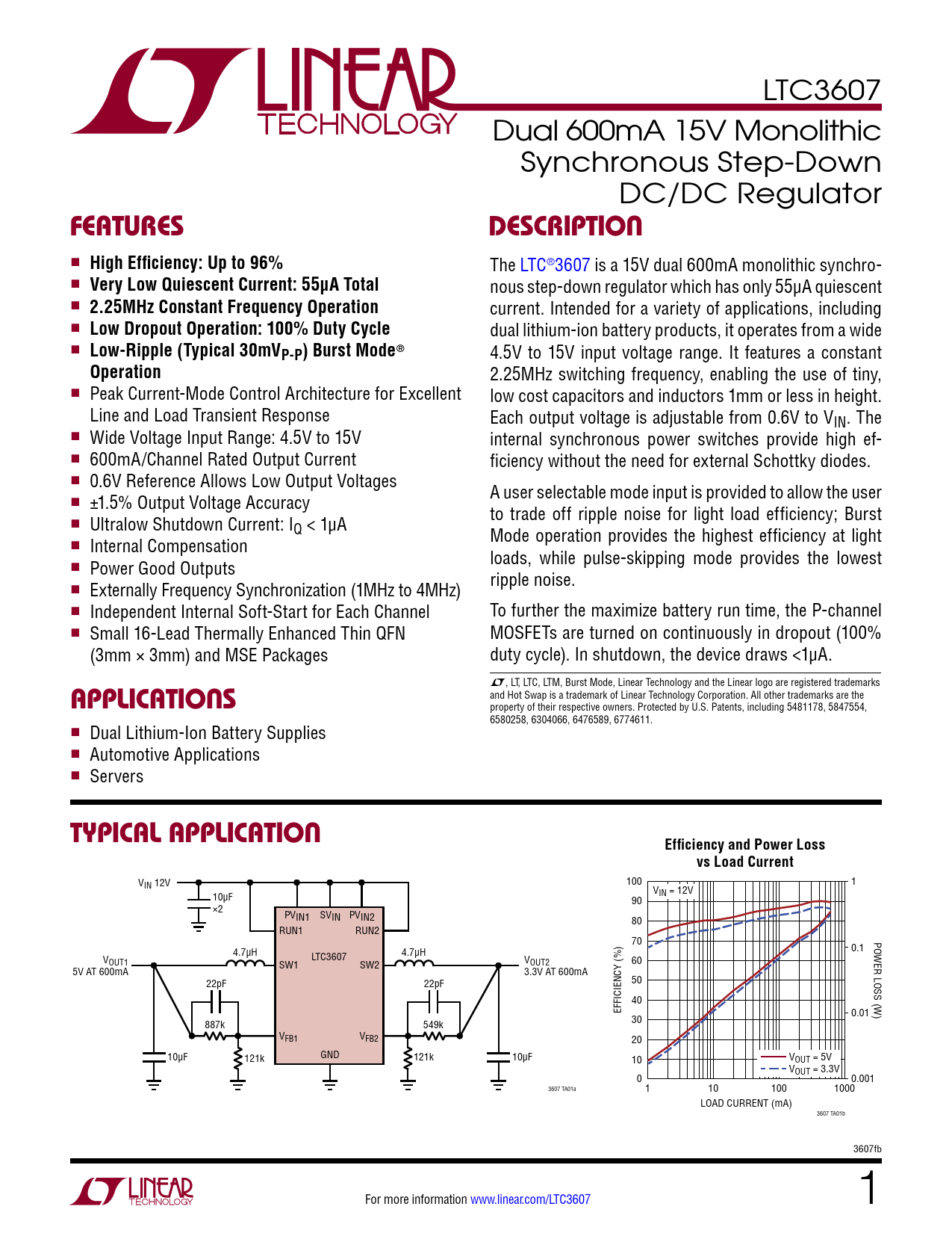 The LTC®3607 is a 15V dual 600mA monolithic synchro- n