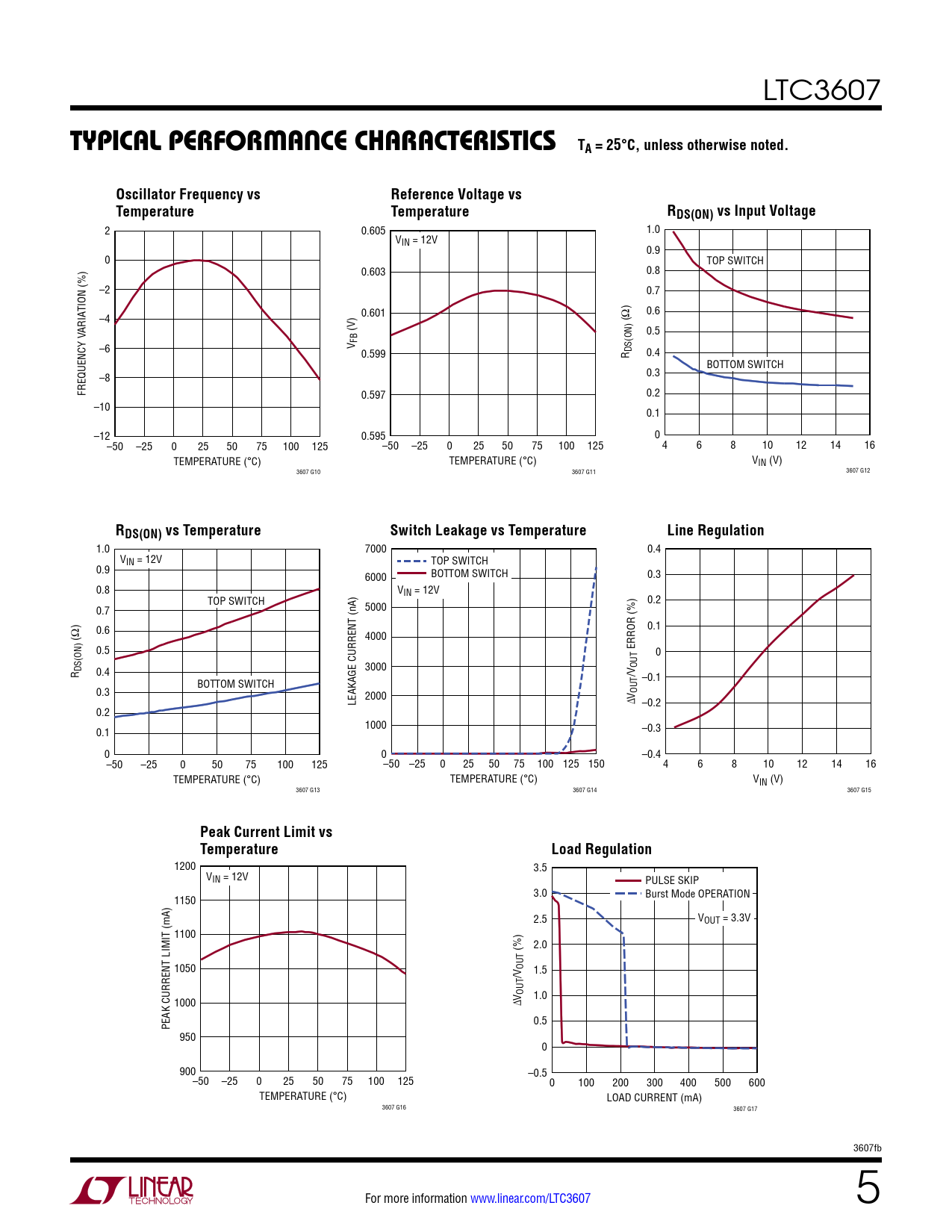 1.0 7000 0.4 VIN = 12V TOP SWITCH 0.9 BOTTOM SWITCH 0.3 6000 0.8 VIN = 12V TOP SWITCH 0.2 5000 0.7 0.1 0.6 4000 (Ω) 0.5 ERROR (%) 0 OUT 3000 R DS(ON) 0.4 /V –0.1 BOTTOM SWITCH OUT 0.3 LEAKAGE CURRENT (nA) 2000 ∆V –0.2 0.2 1000 –0.3 0.1 0 0 –0.4 –50 –25 0 50 75 100 125 –50 –25 0 25 50 75 100 125 150 4 6 8 10 12 14 16 TEMPERATURE (°C) TEMPERATURE (°C) VIN (V) 3607 G13 3607 G14 3607 G15