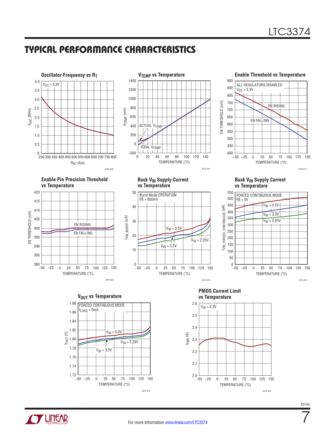 4.0 1400 900 VCC = 3.3V ALL REGULATORS DISABLED 850 3.5 1200 VCC = 3.3V 800 3.0 1000 750 2.5 800 EN RISING 700 (MHz) (mV) 2.0 600 650 EN FALLING f OSC 1.5 V TEMP 400 ACTUAL V 600 TEMP EN THRESHOLD (mV) 550 1.0 200 500 0.5 0 IDEAL V 450 TEMP 0 –200 400 250 300 350 400 450 500 550 600 650 700 750 800 0 20 40 60 80 100 120 140 –50 –25 0 25 50 75 100 125 150 RRT (kΩ) TEMPERATURE (°C) TEMPERATURE (°C) 3374 G09 3374 G10 3374 G11