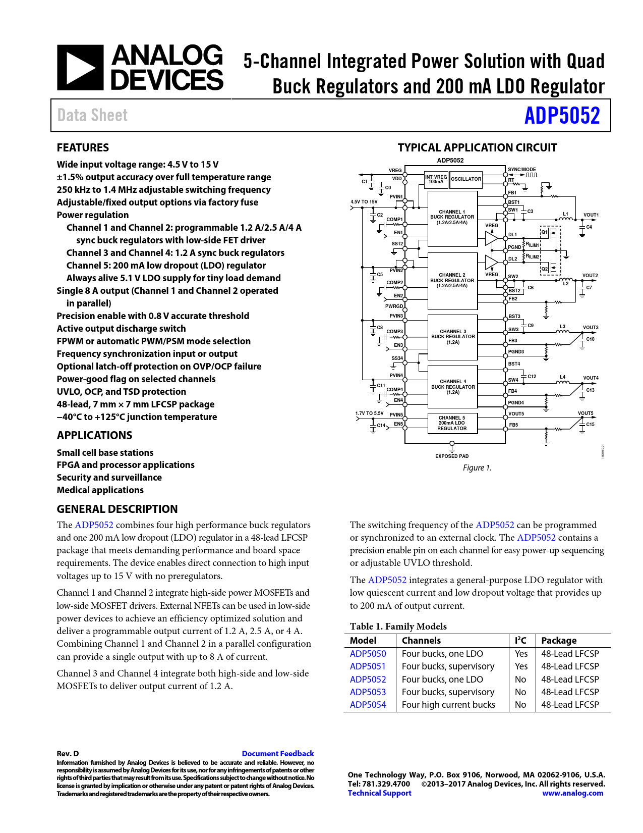 The ADP5052 combines four high performance buck regulators The switching frequency of the ADP5052 can be programmed and one 200 mA low dropout (LDO) regulator in a 48-lead LFCSP or synchronized to an external clock. The ADP5052 contains a package that meets demanding performance and board space precision enable pin on each channel for easy power-up sequencing requirements. The device enables direct connection to high input or adjustable UVLO threshold. voltages up to 15 V with no preregulators. The ADP5052 integrates a general-purpose LDO regulator with Channel 1 and Channel 2 integrate high-side power MOSFETs and low quiescent current and low dropout voltage that provides up low-side MOSFET drivers. External NFETs can be used in low-side to 200 mA of output current. power devices to achieve an efficiency optimized solution and deliver a programmable output current of 1.2 A, 2.5 A, or 4 A.