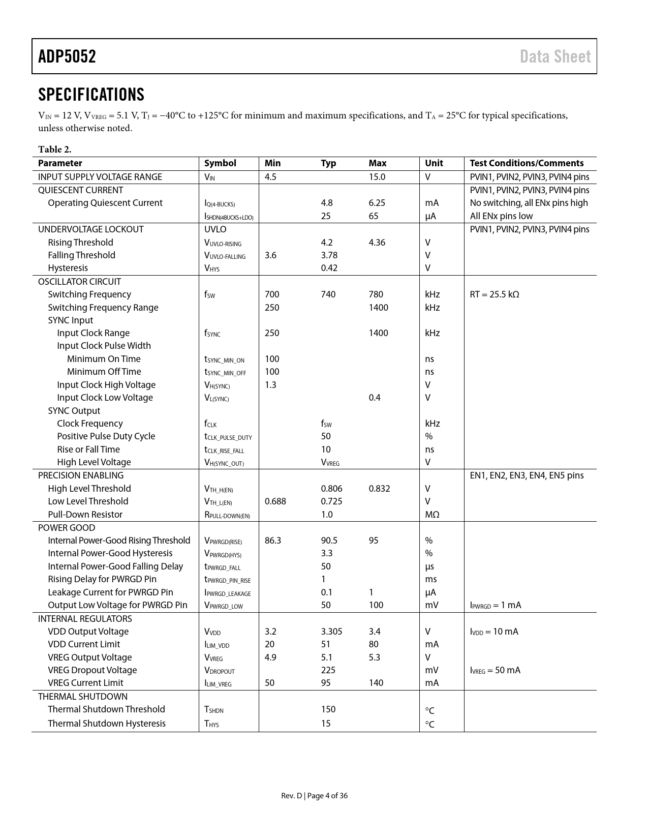 | Seiten / Seite | 36 / 4 — ADP5052. Data Sheet. SPECIFICATIONS. Table 2. Parameter. Symbol. Min. … |