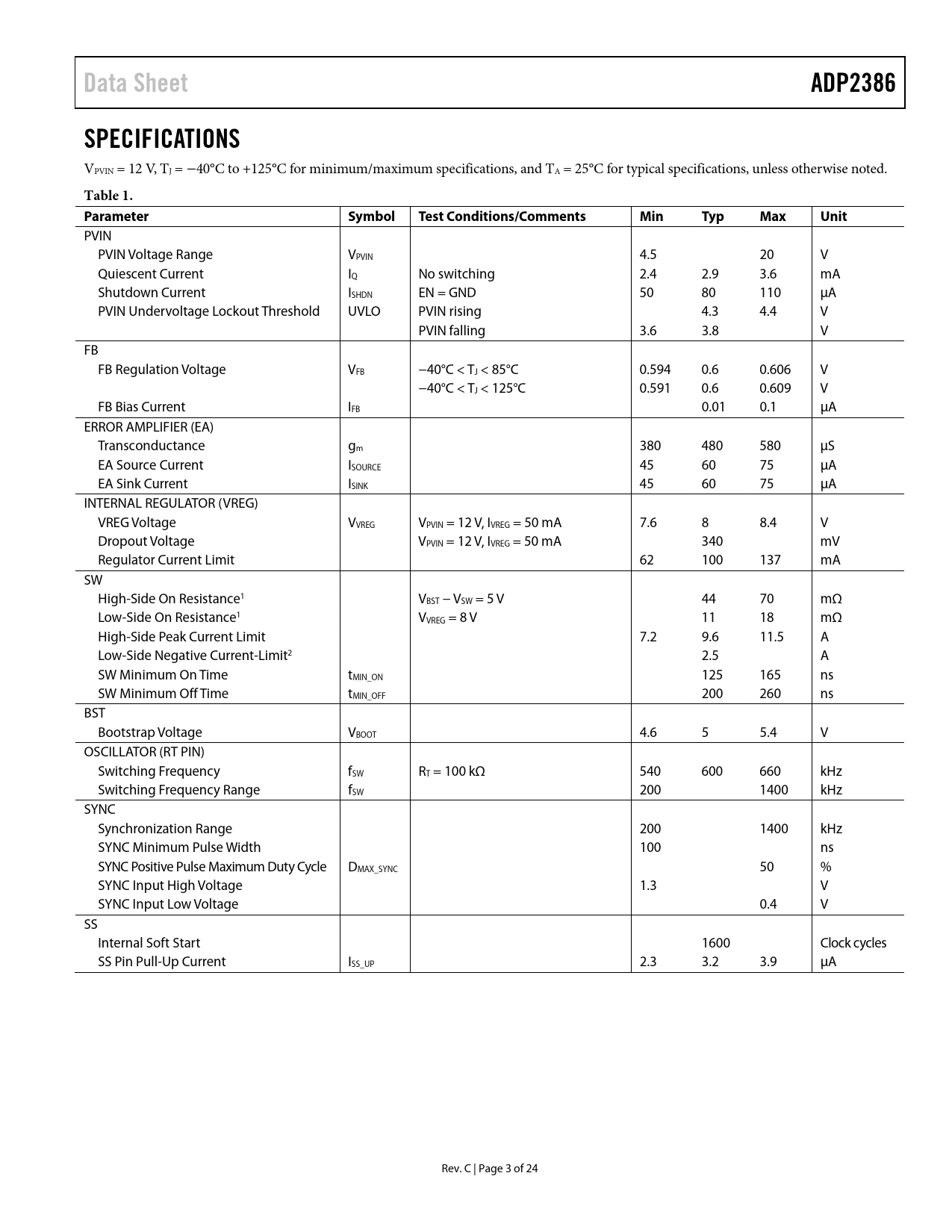Data Sheet. ADP2386. SPECIFICATIONS. Table 1. Parameter. Symbol. Test Conditions/Comments. Min. Typ. Max. Unit