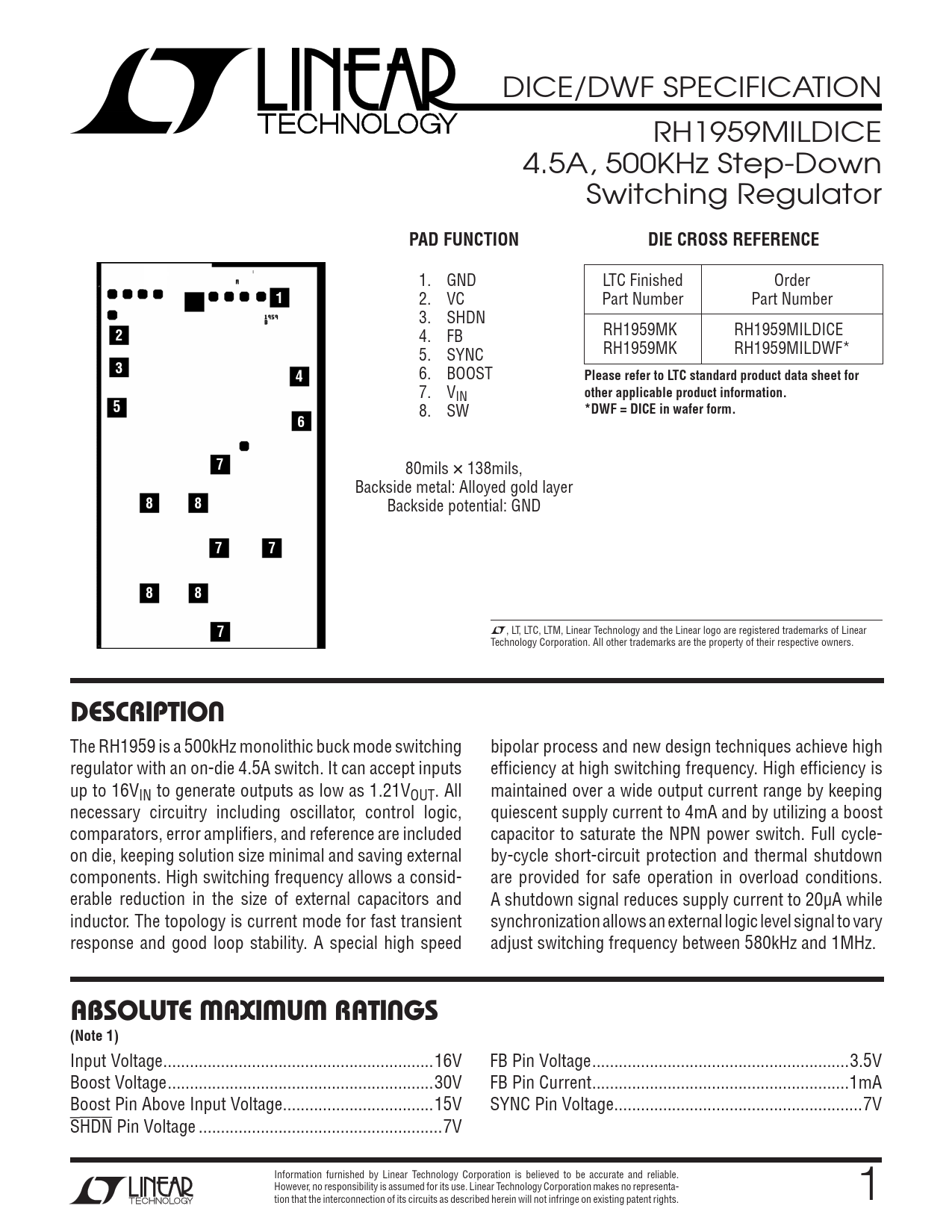 DICE/DWF SPECIFICATION RH1959MILDICE 4.5A, 500KHz Step-Down Switching Regulator PAD FUNCTIONDIE CROSS REFERENCE 1. GND LTC Finished Order 1 2. VC Part Number Part Number 3. SHDN 2 4. FB RH1959MK RH1959MILDICE 5. SYNC RH1959MK RH1959MILDWF* 34 6. BOOST Please refer to LTC standard product data sheet for 7. VIN other applicable product information.5 8. SW *DWF = DICE in wafer form.67 80mils × 138mils, Backside metal: Alloyed gold layer 88 Backside potential: GND 7788 L, LT, LTC, LTM, Linear Technology and the Linear logo are registered trademarks of Linear 7 Technology Corporation. All other trademarks are the property of their respective owners. DESCRIPTION The RH1959 is a 500kHz monolithic buck mode switching bipolar process and new design techniques achieve high regulator with an on-die 4.5A switch. It can accept inputs efficiency at high switching frequency. High efficiency is up to 16VIN to generate outputs as low as 1.21VOUT. All maintained over a wide output current range by keeping necessary circuitry including oscil ator, control logic, quiescent supply current to 4mA and by utilizing a boost comparators, error amplifiers, and reference are included capacitor to saturate the NPN power switch. Full cycle- on die, keeping solution size minimal and saving external by-cycle short-circuit protection and thermal shutdown components. High switching frequency allows a consid- are provided for safe operation in overload conditions. erable reduction in the size of external capacitors and A shutdown signal reduces supply current to 20µA while inductor. The topology is current mode for fast transient synchronization allows an external logic level signal to vary response and good loop stability. A special high speed adjust switching frequency between 580kHz and 1MHz. ABSOLUTE MAXIMUM RATINGS(Note 1) Input Voltage ...16V FB Pin Voltage ..3.5V Boost Voltage ..30V FB Pin Current ..1mA Boost Pin Above Input Voltage ..15V SYNC Pin Voltage ..7V SHDN Pin Voltage ...7V Information furnished by Linear Technology Corporation is believed to be accurate and reliable. However, no responsibility is assumed for its use. Linear Technology Corporation makes no representa- tion that the interconnection of its circuits as described herein will not infringe on existing patent rights. 1