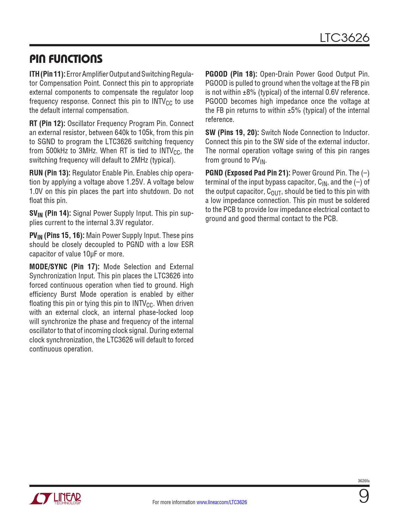 Seiten / Seite28 / 9 — pin FuncTions ITH (Pin 11):. PGOOD (Pin 18):. RT (Pin 12):. SW (Pins 19, …