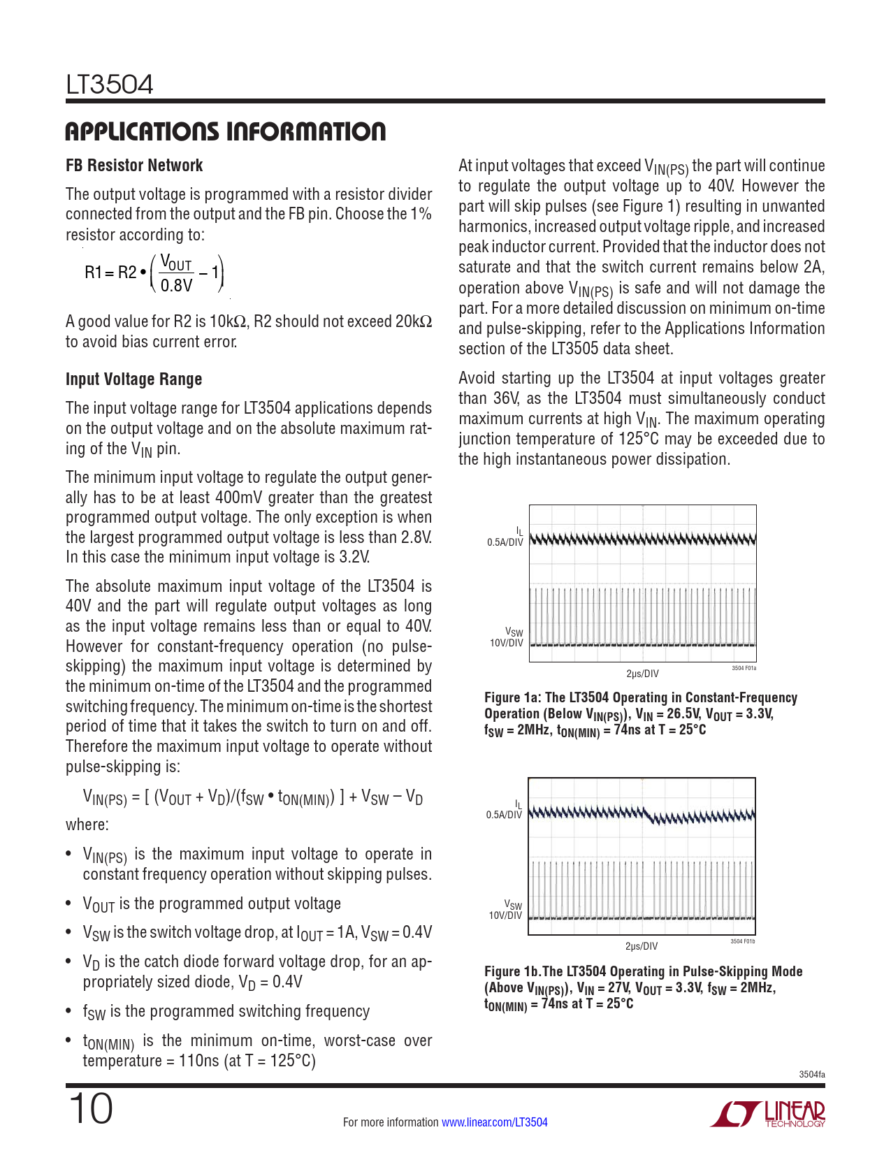 applicaTions inForMaTion. FB Resistor Network. Input Voltage Range. Figure 1a: The LT3504 Operating in Constant-Frequency