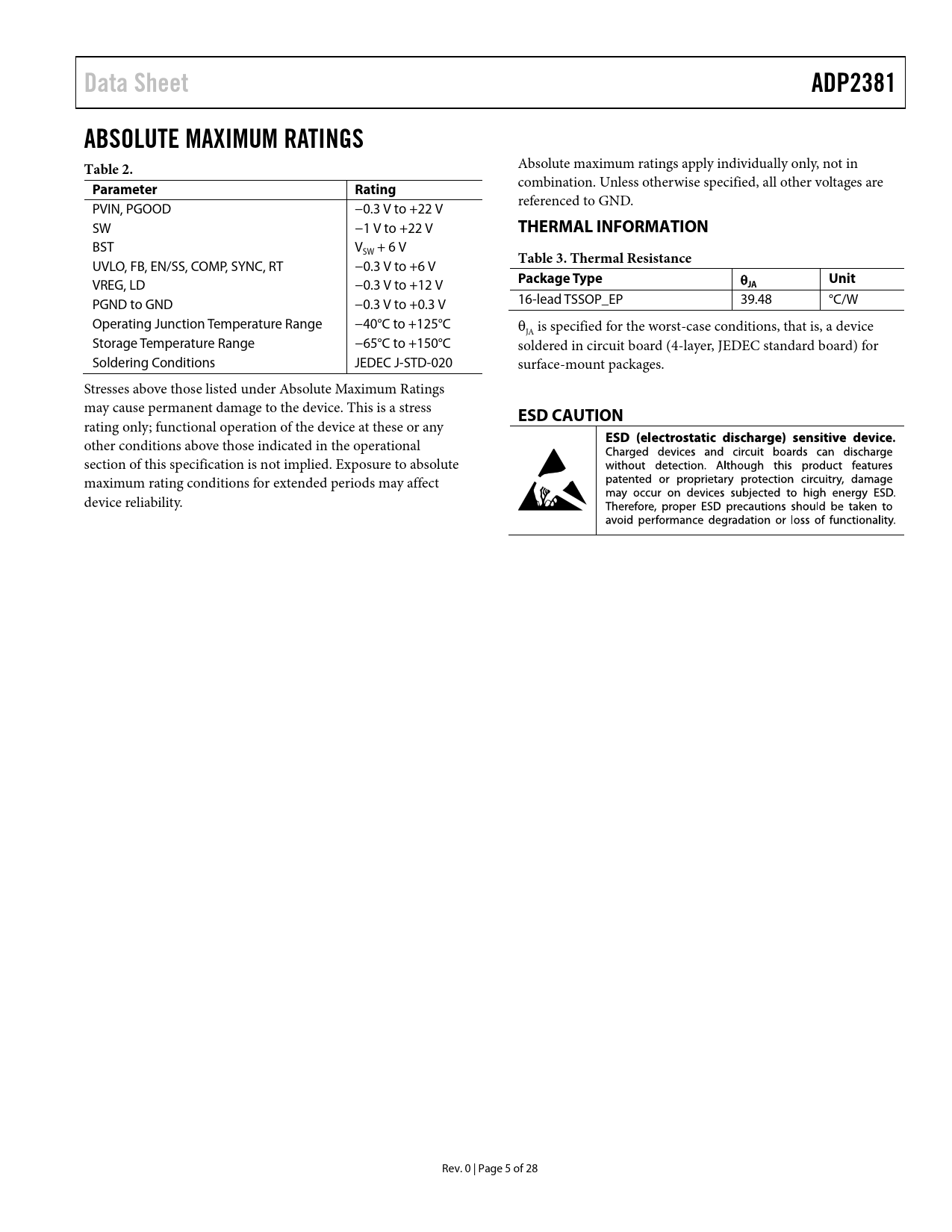 Data Sheet. ADP2381. ABSOLUTE MAXIMUM RATINGS Table 2. Parameter. Rating. THERMAL INFORMATION. Table 3. Thermal Resistance
