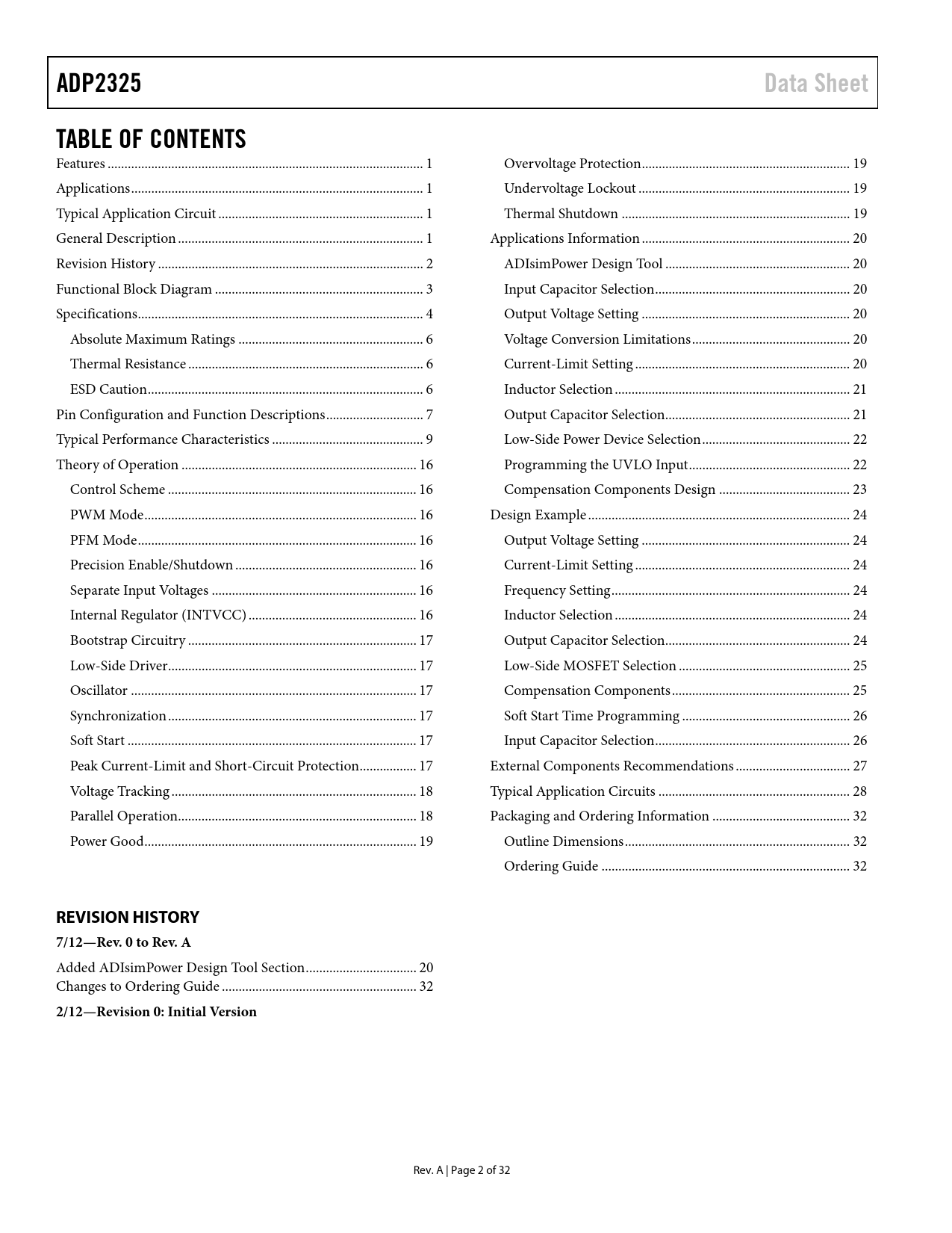 link to page 1 link to page 1 link to page 1 link to page 2 link to page 3 link to page 4 link to page 6 link to page 6 link to page 6 link to page 7 link to page 9 link to page 16 link to page 16 link to page 16 link to page 16 link to page 16 link to page 16 link to page 16 link to page 17 link to page 17 link to page 17 link to page 17 link to page 17 link to page 17 link to page 18 link to page 18 link to page 19 link to page 19 link to page 19 link to page 19 link to page 20 link to page 20 link to page 20 link to page 21 link to page 21 link to page 22 link to page 22 link to page 23 link to page 24 link to page 24 link to page 24 link to page 24 link to page 24 link to page 24 link to page 25 link to page 25 link to page 26 link to page 26 link to page 27 link to page 28 link to page 32 link to page 32 link to page 32 link to page 1 link to page 20 link to page 20 link to page 20 ADP2325Data SheetTABLE OF CONTENTS Features .. 1 Overvoltage Protection .. 19 Applications ... 1 Undervoltage Lockout ... 19 Typical Application Circuit ... 1 Thermal Shutdown .. 19 General Description ... 1 Applications Information .. 20 Revision History ... 2 ADIsimPower Design Tool ... 20 Functional Block Diagram .. 3 Input Capacitor Selection .. 20 Specifications ... 4 Output Voltage Setting .. 20 Absolute Maximum Ratings ... 6 Voltage Conversion Limitations ... 20 Thermal Resistance .. 6 Current-Limit Setting .. 20 ESD Caution .. 6 Inductor Selection .. 21 Pin Configuration and Function Descriptions ... 7 Output Capacitor Selection ... 21 Typical Performance Characteristics ... 9 Low-Side Power Device Selection .. 22 Theory of Operation .. 16 Programming the UVLO Input .. 22 Control Scheme .. 16 Compensation Components Design ... 23 PWM Mode ... 16 Design Example .. 24 PFM Mode ... 16 Output Voltage Setting .. 24 Precision Enable/Shutdown .. 16 Current-Limit Setting .. 24 Separate Input Voltages ... 16 Frequency Setting ... 24 Internal Regulator (INTVCC) .. 16 Inductor Selection .. 24 Bootstrap Circuitry .. 17 Output Capacitor Selection ... 24 Low-Side Driver .. 17 Low-Side MOSFET Selection ... 25 Oscillator ... 17 Compensation Components ... 25 Synchronization .. 17 Soft Start Time Programming .. 26 Soft Start .. 17 Input Capacitor Selection .. 26 Peak Current-Limit and Short-Circuit Protection ... 17 External Components Recommendations .. 27 Voltage Tracking ... 18 Typical Application Circuits ... 28 Parallel Operation... 18 Packaging and Ordering Information ... 32 Power Good ... 19 Outline Dimensions ... 32 Ordering Guide .. 32 REVISION HISTORY7/12—Rev. 0 to Rev. A Added ADIsimPower Design Tool Section ... 20 Changes to Ordering Guide .. 32 2/12—Revision 0: Initial Version Rev. A | Page 2 of 32 Document Outline Features Applications Typical Application Circuit General Description Revision History Functional Block Diagram Specifications Absolute Maximum Ratings Thermal Resistance Boundary Condition ESD Caution Pin Configuration and Function Descriptions Typical Performance Characteristics Theory of Operation Control Scheme PWM Mode PFM Mode Precision Enable/Shutdown Separate Input Voltages Internal Regulator (INTVCC) Bootstrap Circuitry Low-Side Driver Oscillator Synchronization Soft Start Peak Current-Limit and Short-Circuit Protection Voltage Tracking Coincident Tracking Ratiometric Tracking Parallel Operation Power Good Overvoltage Protection Undervoltage Lockout Thermal Shutdown Applications Information ADIsimPower Design Tool Input Capacitor Selection Output Voltage Setting Voltage Conversion Limitations Current-Limit Setting Inductor Selection Output Capacitor Selection Low-Side Power Device Selection Programming the UVLO Input Compensation Components Design Design Example Output Voltage Setting Current-Limit Setting Frequency Setting Inductor Selection Output Capacitor Selection Low-Side MOSFET Selection Compensation Components Soft Start Time Programming Input Capacitor Selection External Components Recommendations Typical Application Circuits Packaging and Ordering Information Outline Dimensions Ordering Guide