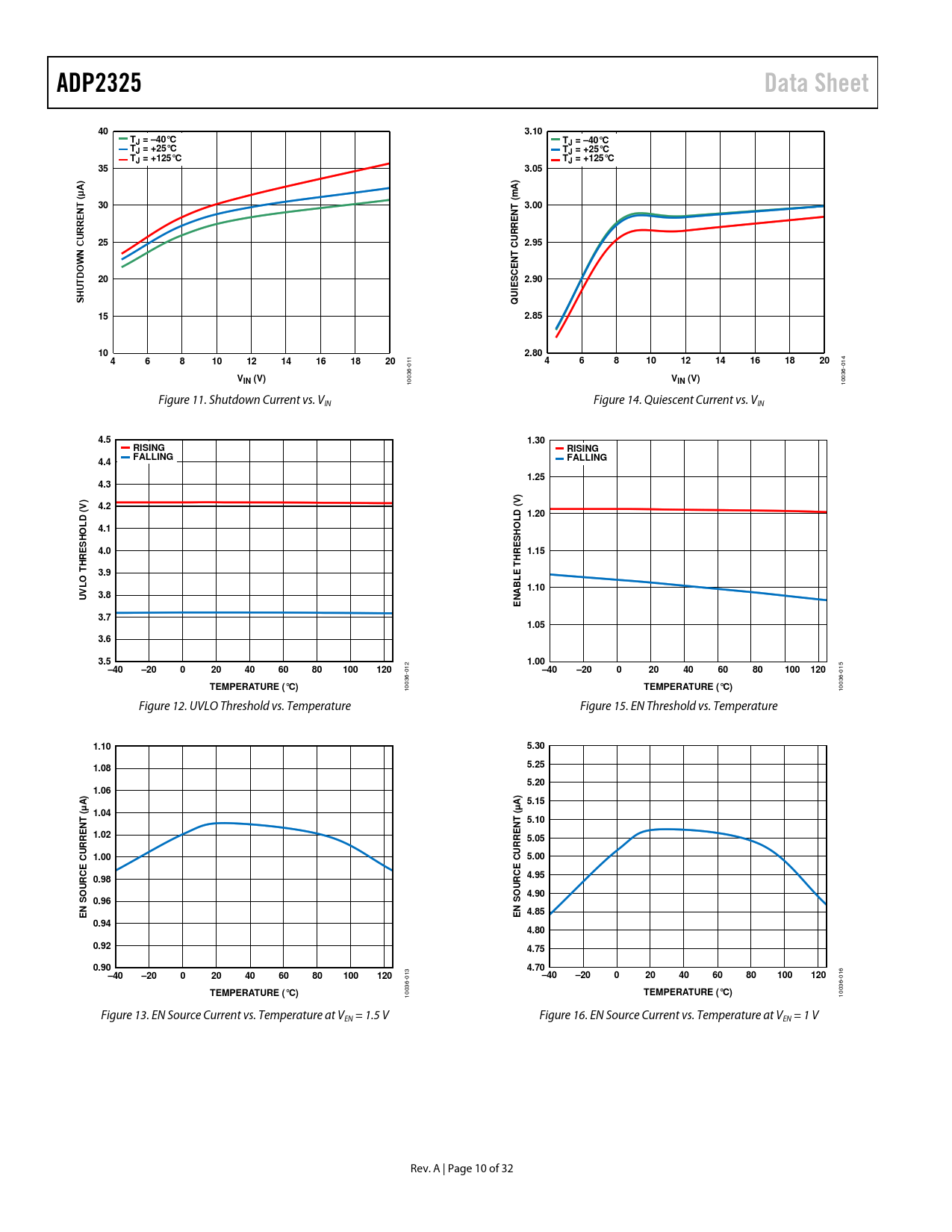ADP2325Data Sheet403.10TJ = –40°CTJ = –40°CTJ = +25°CTJ = +25°CTJ = +125°CTJ = +125°C353.05(μA)mA) (30NT3.00NT25CURRE2.95NCURREWNTDOCE20S 2.90ESHUTUI Q152.85102.80468101214161820 1 1 468101214161820 0 014 VIN (V)V 10036- IN (V) 10036- Figure 11. Shutdown Current vs. VIN Figure 14. Quiescent Current vs. VIN 4.51.30RISINGRISINGFALLINGFALLING4.41.254.3))VV4.2D (D (1.20LL4.1HOHOSS4.01.15HREHRETT3.9EO L1.103.8UVNABL E3.71.053.63.51.00–40–20020406080100120 012 –40–20020406080100120 015 TEMPERATURE (°C) 10036- TEMPERATURE (°C) 10036- Figure 12. UVLO Threshold vs. Temperature Figure 15. EN Threshold vs. Temperature 1.105.305.251.085.201.06A)A) 5.15µµ( 1.04( 5.10NTNT1.025.051.00CURRE5.00CURRE4.950.98URCEURCEOO 4.900.96N SN SE4.85E0.944.800.924.750.904.70–40–20020406080100120 013 –40–20020406080100120 016 TEMPERATURE (°C)TEMPERATURE (°C) 10036- 10036- Figure 13. EN Source Current vs. Temperature at VEN = 1.5 V Figure 16. EN Source Current vs. Temperature at VEN = 1 V Rev. A | Page 10 of 32 Document Outline Features Applications Typical Application Circuit General Description Revision History Functional Block Diagram Specifications Absolute Maximum Ratings Thermal Resistance Boundary Condition ESD Caution Pin Configuration and Function Descriptions Typical Performance Characteristics Theory of Operation Control Scheme PWM Mode PFM Mode Precision Enable/Shutdown Separate Input Voltages Internal Regulator (INTVCC) Bootstrap Circuitry Low-Side Driver Oscillator Synchronization Soft Start Peak Current-Limit and Short-Circuit Protection Voltage Tracking Coincident Tracking Ratiometric Tracking Parallel Operation Power Good Overvoltage Protection Undervoltage Lockout Thermal Shutdown Applications Information ADIsimPower Design Tool Input Capacitor Selection Output Voltage Setting Voltage Conversion Limitations Current-Limit Setting Inductor Selection Output Capacitor Selection Low-Side Power Device Selection Programming the UVLO Input Compensation Components Design Design Example Output Voltage Setting Current-Limit Setting Frequency Setting Inductor Selection Output Capacitor Selection Low-Side MOSFET Selection Compensation Components Soft Start Time Programming Input Capacitor Selection External Components Recommendations Typical Application Circuits Packaging and Ordering Information Outline Dimensions Ordering Guide