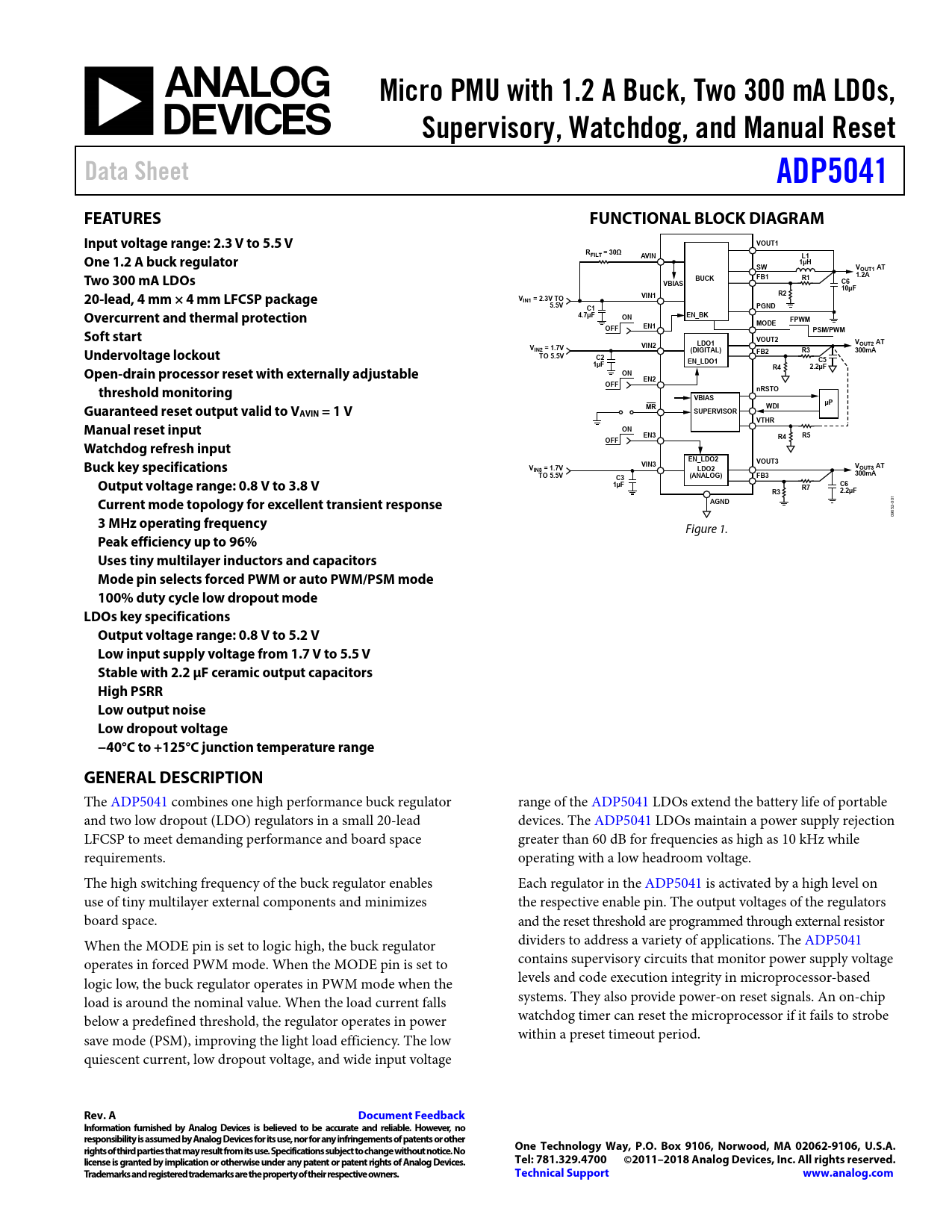 Micro PMU with 1.2 A Buck, Two 300 mA LDOs,. Supervisory, Watchdog, and Manual Reset. Data Sheet. ADP5041. FEATURES