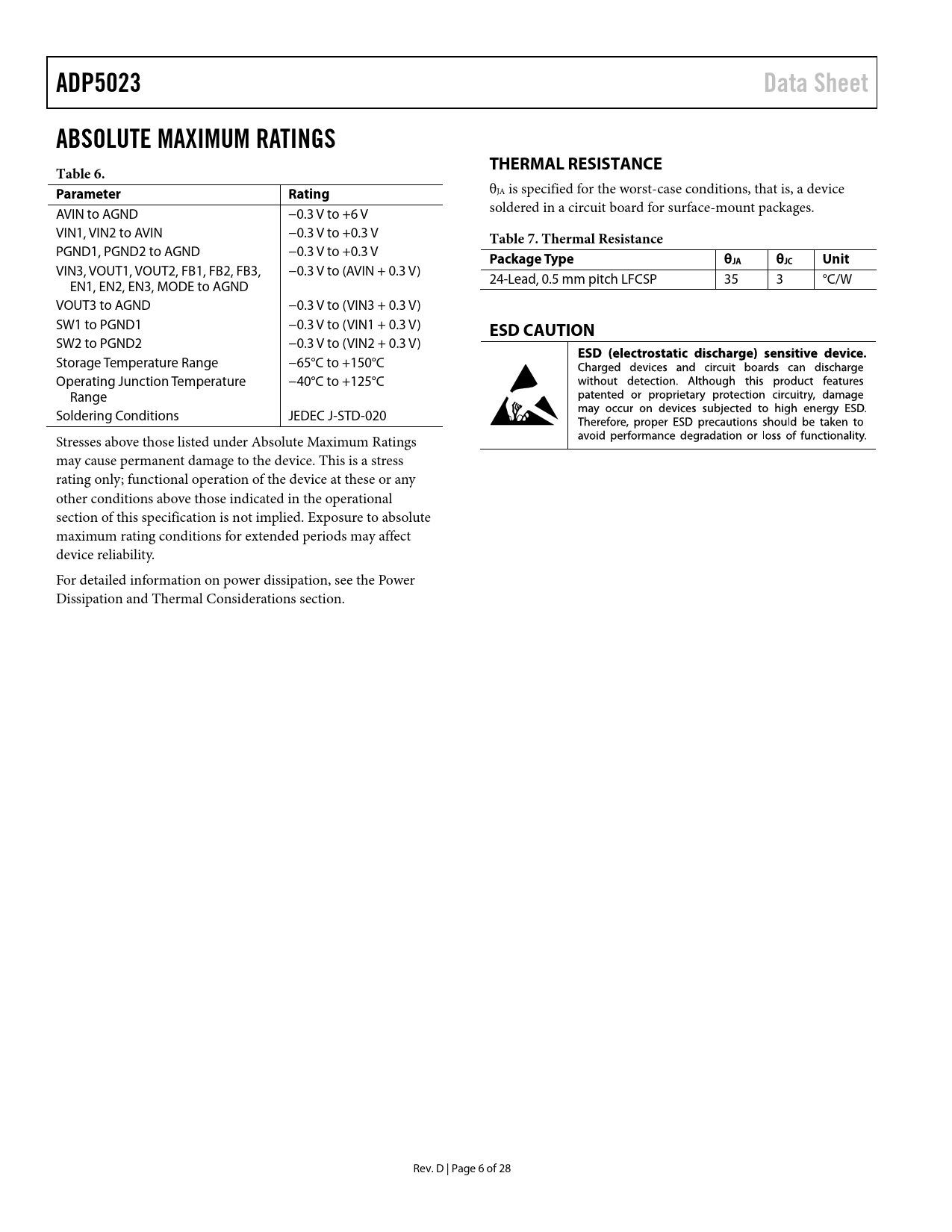 ADP5023 Data Sheet ABSOLUTE MAXIMUM RATINGS THERMAL RESISTANCE Table 6 Parameter Rating Table 7 Thermal Resistance