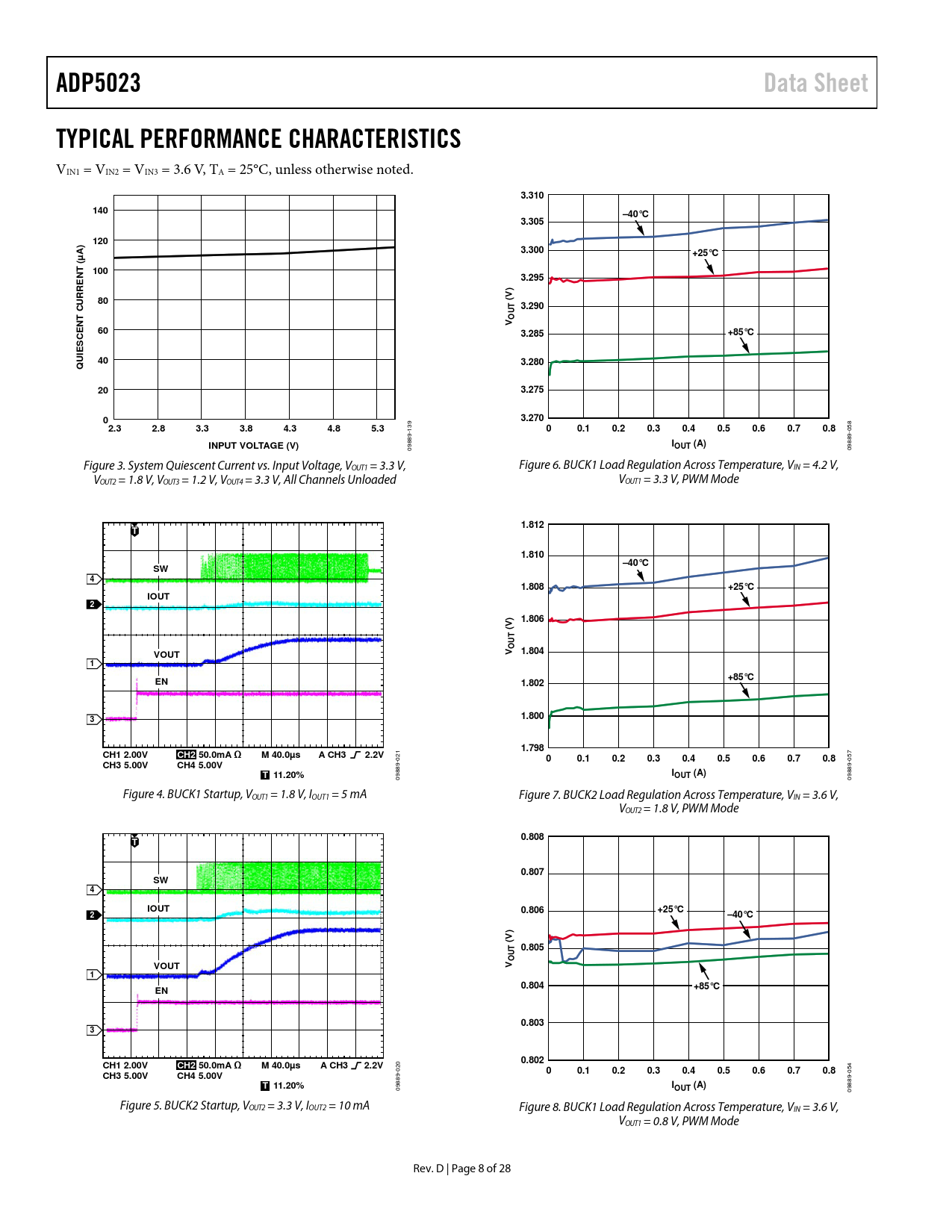 09889- Figure 4. BUCK1 Startup, VOUT1 = 1.8 V, IOUT1 = 5 mA Figure 7. BUCK2 Load Regulation Across Temperature, VIN = 3.6 V, VOUT2 = 1.8 V, PWM Mode
