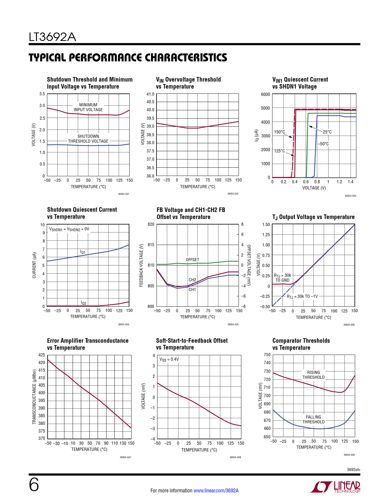 425 4 750 V 420 SS = 0.4V 740 3 415 730 RISING 410 2 720 THRESHOLD 405 1 710 400 700 395 TAGE (mV) 0 690 390 VOL –1 VOLTAGE (mV) 680 385 FALLING –2 670 TRANSCONDUCTANCE (µMho) THRESHOLD 380 –3 660 375 650 370 –4 –50 –25 0 25 50 75 100 125 150 –50 –30 –10 10 30 50 70 90 110 130 150 –50 –25 0 25 50 75 100 125 150 TEMPERATURE (°C) TEMPERATURE (°C) TEMPERATURE (°C) 3692A G09 3692A G07 3692A G08 3692afc 6 For more information www.linear.com/3692A Document Outline Features Description Applications Typical Application Absolute Maximum Ratings Pin Configuration Order Information Electrical Characteristics Typical Performance Characteristics Pin Functions Block Diagram Applications Information Typical Applications Package Description Revision History Typical Application Related Parts