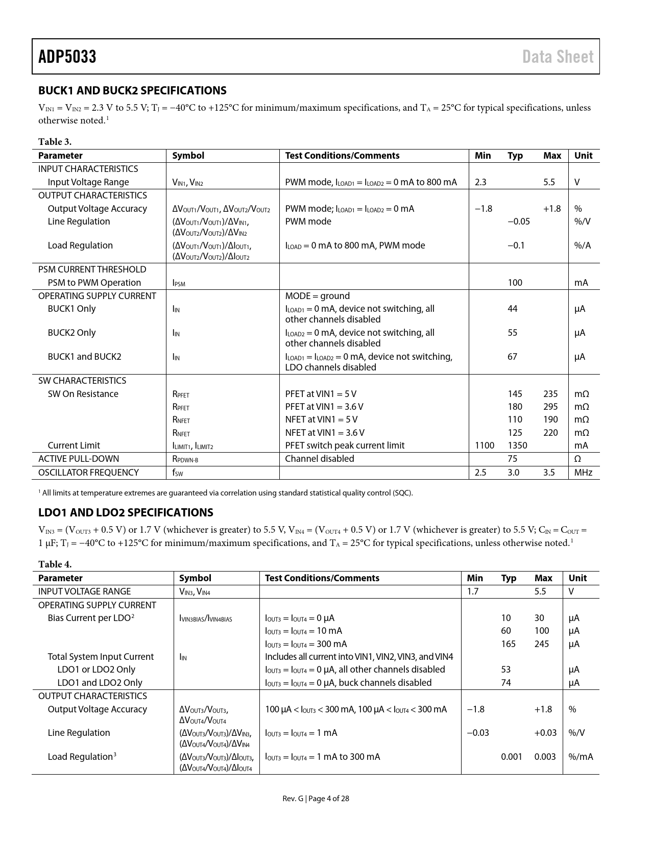 Seiten / Seite28 / 4 — ADP5033. Data Sheet. BUCK1 AND BUCK2 SPECIFICATIONS. Table 3. Parameter. …