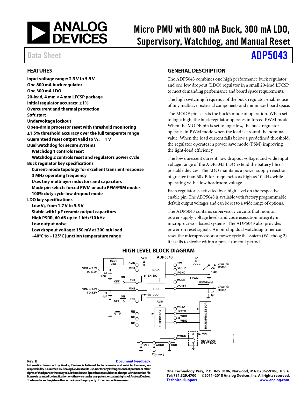 Micro PMU with 800 mA Buck, 300 mA LDO,. Supervisory, Watchdog, and Manual Reset. Data Sheet. ADP5043. FEATURES