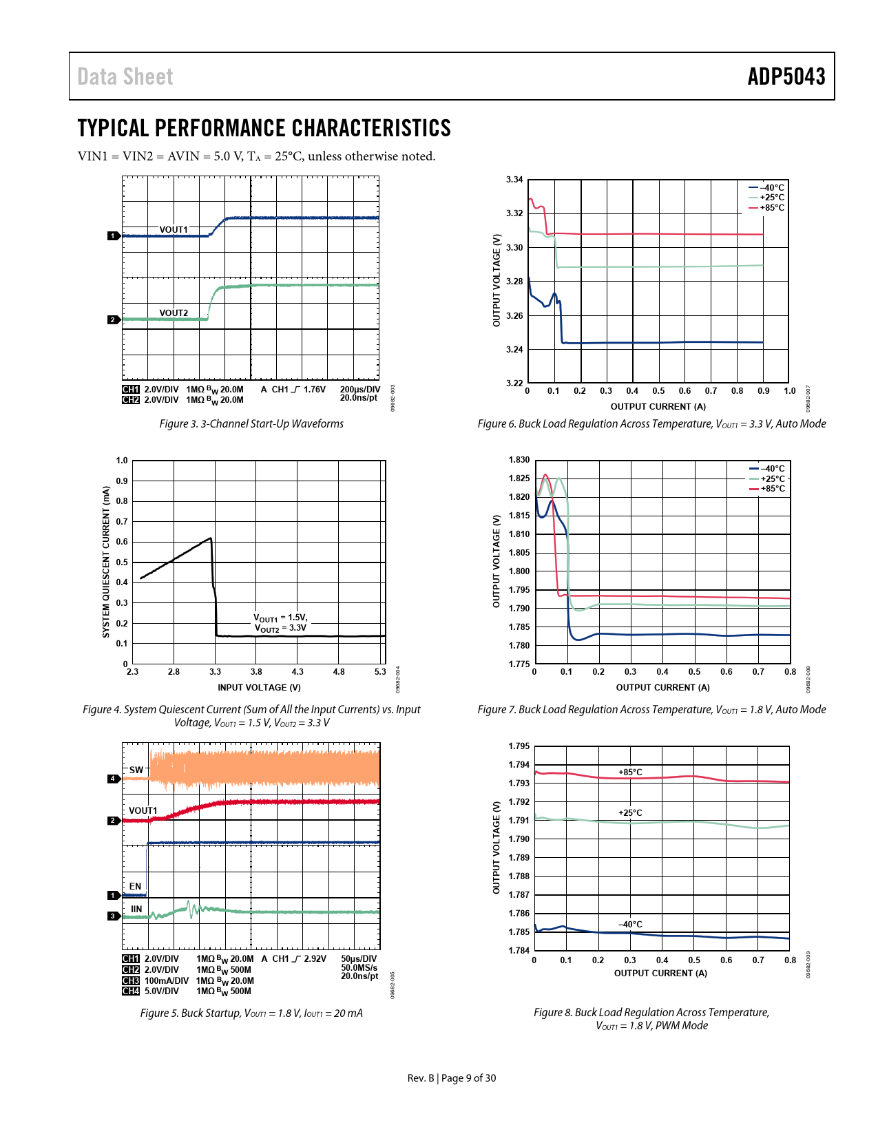 Data Sheet. ADP5043. TYPICAL PERFORMANCE CHARACTERISTICS. 3.34. –40°C +25°C +85°C. 3.32. VOUT1. ) V ( 3.30. E G. LTA O 3.28 T V U. VOUT2