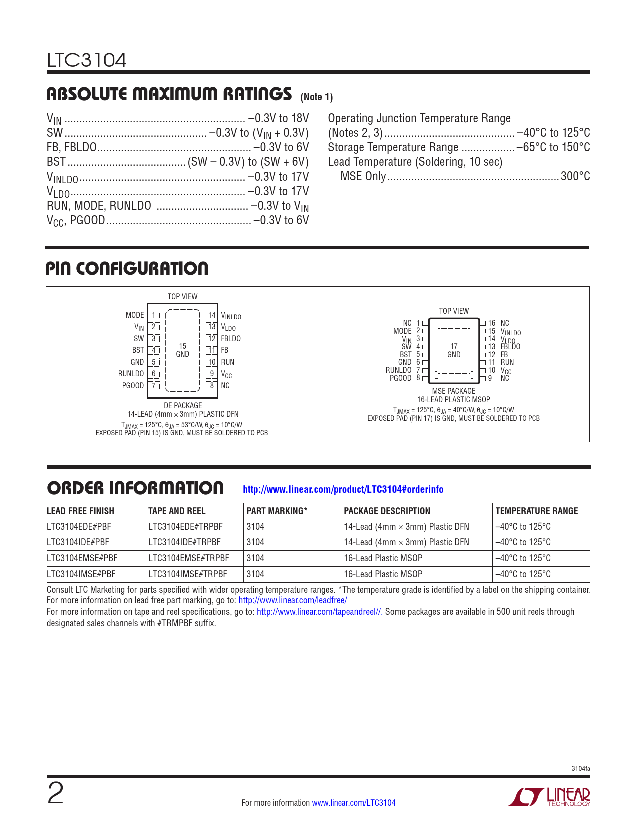 LTC3104 ABSOLUTE MAXIMUM RATINGS (Note 1) VIN ... –0.3V to 18V Operating Junction Temperature Range SW .. –0.3V to (VIN + 0.3V) (Notes 2, 3) .. –40°C to 125°C FB, FBLDO .. –0.3V to 6V Storage Temperature Range .. –65°C to 150°C BST ..(SW – 0.3V) to (SW + 6V) Lead Temperature (Soldering, 10 sec) VINLDO .. –0.3V to 17V MSE Only ..300°C VLDO ... –0.3V to 17V RUN, MODE, RUNLDO ... –0.3V to VIN VCC, PGOOD ... –0.3V to 6V PIN CONFIGURATION TOP VIEW MODE 1 14 V TOP VIEW INLDO V NC 1 16 NC IN 2 13 VLDO MODE 2 15 VINLDO SW 3 12 FBLDO V 3 IN 14 VLDO BST 4 15 11 FB SW 4 17 13 FBLDO GND BST 5 GND 12 FB GND 5 10 RUN GND 6 11 RUN RUNLDO 6 9 V RUNLDO 7 10 V CC CC PGOOD 8 9 NC PGOOD 7 8 NC MSE PACKAGE 16-LEAD PLASTIC MSOP DE PACKAGE 14-LEAD (4mm × 3mm) PLASTIC DFN T JMAX = 125°C, θJA = 40°C/W, θJC = 10°C/W EXPOSED PAD (PIN 17) IS GND, MUST BE SOLDERED TO PCB TJMAX = 125°C, θJA = 53°C/W, θJC = 10°C/W EXPOSED PAD (PIN 15) IS GND, MUST BE SOLDERED TO PCB ORDER INFORMATION http://www.linear.com/product/LTC3104#orderinfoLEAD FREE FINISHTAPE AND REELPART MARKING*PACKAGE DESCRIPTIONTEMPERATURE RANGE LTC3104EDE#PBF LTC3104EDE#TRPBF 3104 14-Lead (4mm × 3mm) Plastic DFN –40°C to 125°C LTC3104IDE#PBF LTC3104IDE#TRPBF 3104 14-Lead (4mm × 3mm) Plastic DFN –40°C to 125°C LTC3104EMSE#PBF LTC3104EMSE#TRPBF 3104 16-Lead Plastic MSOP –40°C to 125°C LTC3104IMSE#PBF LTC3104IMSE#TRPBF 3104 16-Lead Plastic MSOP –40°C to 125°C Consult LTC Marketing for parts specified with wider operating temperature ranges. *The temperature grade is identified by a label on the shipping container. For more information on lead free part marking, go to: http://www.linear.com/leadfree/ For more information on tape and reel specifications, go to: http://www.linear.com/tapeandreel//. Some packages are available in 500 unit reels through designated sales channels with #TRMPBF suffix. 3104fa 2 For more information www.linear.com/LTC3104 Document Outline Features Applications Description Typical Application Absolute Maximum Ratings Order Information Electrical Characteristics Typical Performance Characteristics Pin Functions Block Diagram Operation Applications Information Typical Applications Package Description Typical Application Related Parts
