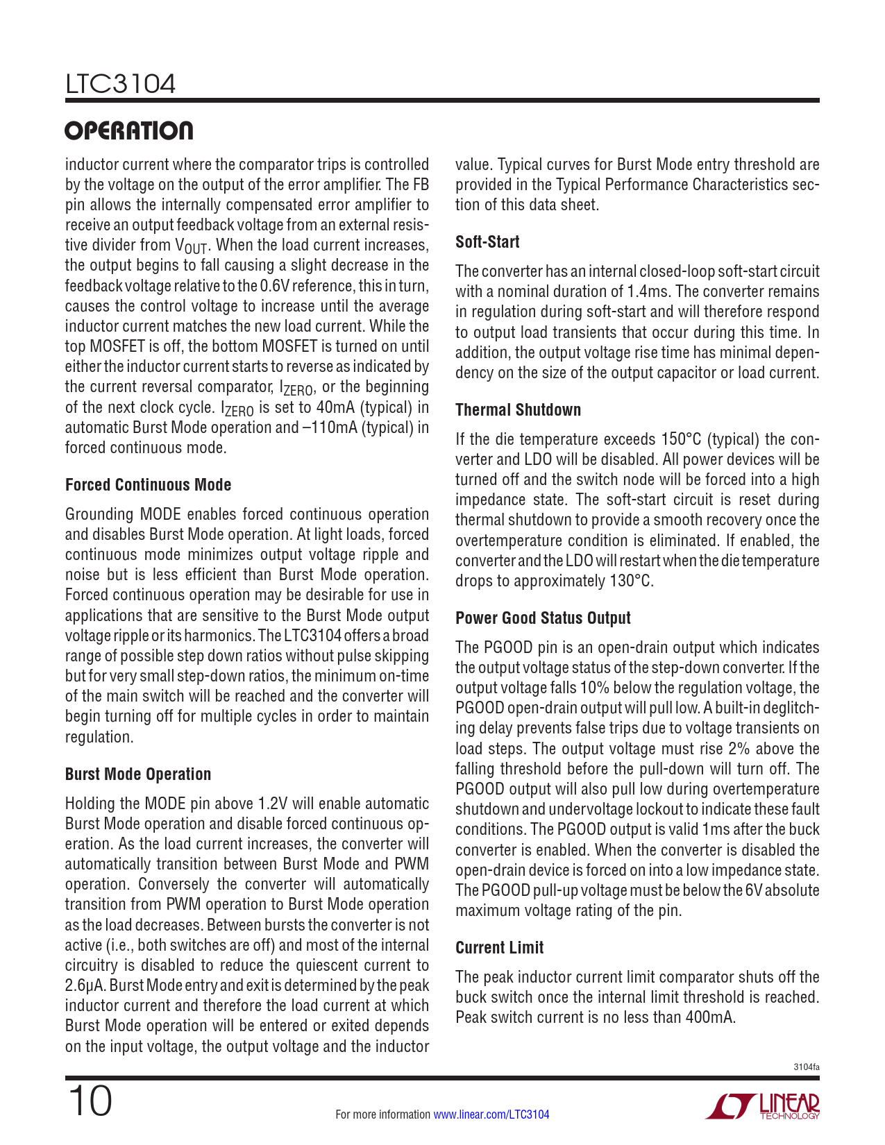LTC3104 OPERATION inductor current where the comparator trips is controlled value. Typical curves for Burst Mode entry threshold are by the voltage on the output of the error amplifier. The FB provided in the Typical Performance Characteristics sec- pin allows the internally compensated error amplifier to tion of this data sheet. receive an output feedback voltage from an external resis- tive divider from VOUT . When the load current increases, Soft-Start the output begins to fall causing a slight decrease in the The converter has an internal closed-loop soft-start circuit feedback voltage relative to the 0.6V reference, this in turn, with a nominal duration of 1.4ms. The converter remains causes the control voltage to increase until the average in regulation during soft-start and will therefore respond inductor current matches the new load current. While the to output load transients that occur during this time. In top MOSFET is off, the bottom MOSFET is turned on until addition, the output voltage rise time has minimal depen- either the inductor current starts to reverse as indicated by dency on the size of the output capacitor or load current. the current reversal comparator, IZERO, or the beginning of the next clock cycle. IZERO is set to 40mA (typical) in Thermal Shutdown automatic Burst Mode operation and –110mA (typical) in forced continuous mode. If the die temperature exceeds 150°C (typical) the con- verter and LDO will be disabled. All power devices will be Forced Continuous Mode turned off and the switch node will be forced into a high impedance state. The soft-start circuit is reset during Grounding MODE enables forced continuous operation thermal shutdown to provide a smooth recovery once the and disables Burst Mode operation. At light loads, forced overtemperature condition is eliminated. If enabled, the continuous mode minimizes output voltage ripple and converter and the LDO will restart when the die temperature noise but is less efficient than Burst Mode operation. drops to approximately 130°C. Forced continuous operation may be desirable for use in applications that are sensitive to the Burst Mode output Power Good Status Output voltage ripple or its harmonics. The LTC3104 offers a broad range of possible step down ratios without pulse skipping The PGOOD pin is an open-drain output which indicates but for very small step-down ratios, the minimum on-time the output voltage status of the step-down converter. If the of the main switch will be reached and the converter will output voltage falls 10% below the regulation voltage, the begin turning off for multiple cycles in order to maintain PGOOD open-drain output will pull low. A built-in deglitch- regulation. ing delay prevents false trips due to voltage transients on load steps. The output voltage must rise 2% above the Burst Mode Operation falling threshold before the pull-down will turn off. The PGOOD output will also pull low during overtemperature Holding the MODE pin above 1.2V will enable automatic shutdown and undervoltage lockout to indicate these fault Burst Mode operation and disable forced continuous op- conditions. The PGOOD output is valid 1ms after the buck eration. As the load current increases, the converter will converter is enabled. When the converter is disabled the automatically transition between Burst Mode and PWM open-drain device is forced on into a low impedance state. operation. Conversely the converter will automatically The PGOOD pull-up voltage must be below the 6V absolute transition from PWM operation to Burst Mode operation maximum voltage rating of the pin. as the load decreases. Between bursts the converter is not active (i.e., both switches are off) and most of the internal Current Limit circuitry is disabled to reduce the quiescent current to 2.6µA. Burst Mode entry and exit is determined by the peak The peak inductor current limit comparator shuts off the inductor current and therefore the load current at which buck switch once the internal limit threshold is reached. Burst Mode operation will be entered or exited depends Peak switch current is no less than 400mA. on the input voltage, the output voltage and the inductor 3104fa 10 For more information www.linear.com/LTC3104 Document Outline Features Applications Description Typical Application Absolute Maximum Ratings Order Information Electrical Characteristics Typical Performance Characteristics Pin Functions Block Diagram Operation Applications Information Typical Applications Package Description Typical Application Related Parts