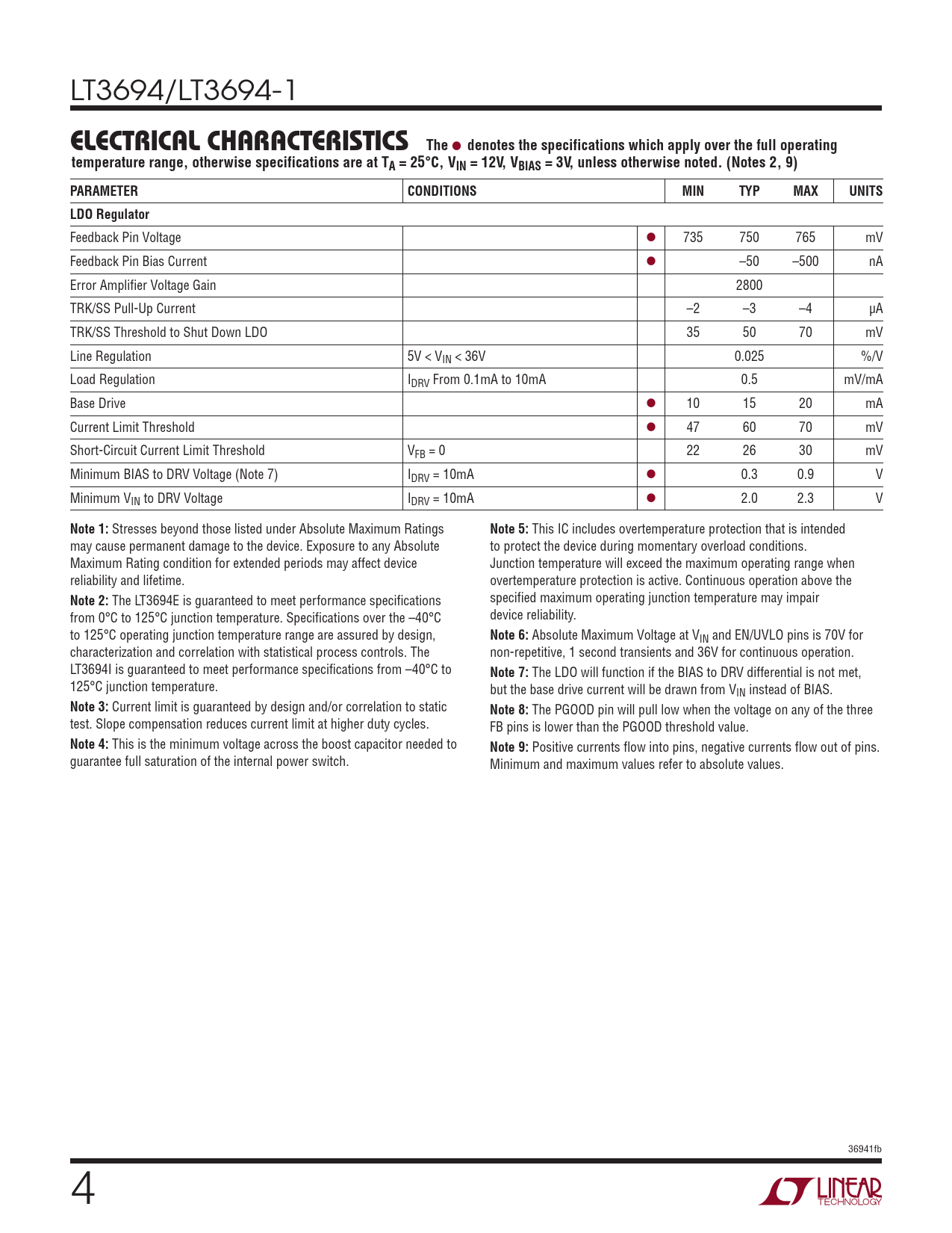 Feedback Pin Voltage l 735 750 765 mV Feedback Pin Bias Current l –50 –500 nA Error Amplifier Voltage Gain 2800 TRK/SS Pull-Up Current –2 –3 –4 µA TRK/SS Threshold to Shut Down LDO 35 50 70 mV Line Regulation 5V < VIN < 36V 0.025 %/V Load Regulation IDRV From 0.1mA to 10mA 0.5 mV/mA Base Drive l 10 15 20 mA Current Limit Threshold l 47 60 70 mV Short-Circuit Current Limit Threshold VFB = 0 22 26 30 mV Minimum BIAS to DRV Voltage (Note 7) IDRV = 10mA l 0.3 0.9 V Minimum VIN to DRV Voltage IDRV = 10mA l 2.0 2.3 V