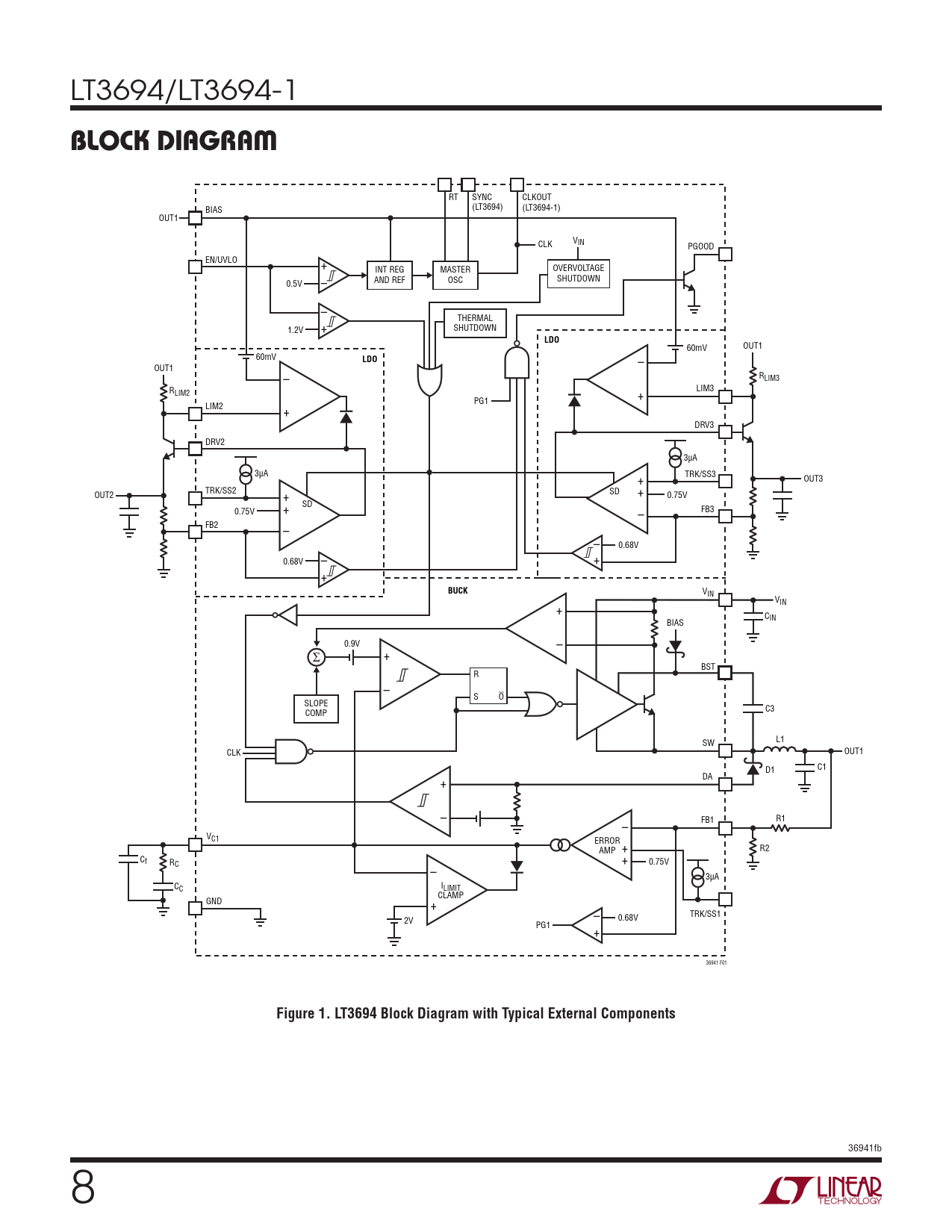 VIN VIN + C BIAS IN 0.9V – Σ + BST R – S O SLOPE COMP C3 SW L1 CLK OUT1 C1 D1 DA + – – FB1 R1 VC1 ERROR + AMP R2 C + f R 0.75V C – 3µA CC ILIMIT CLAMP GND + – 0.68V TRK/SS1 2V PG1 + 36941 F01