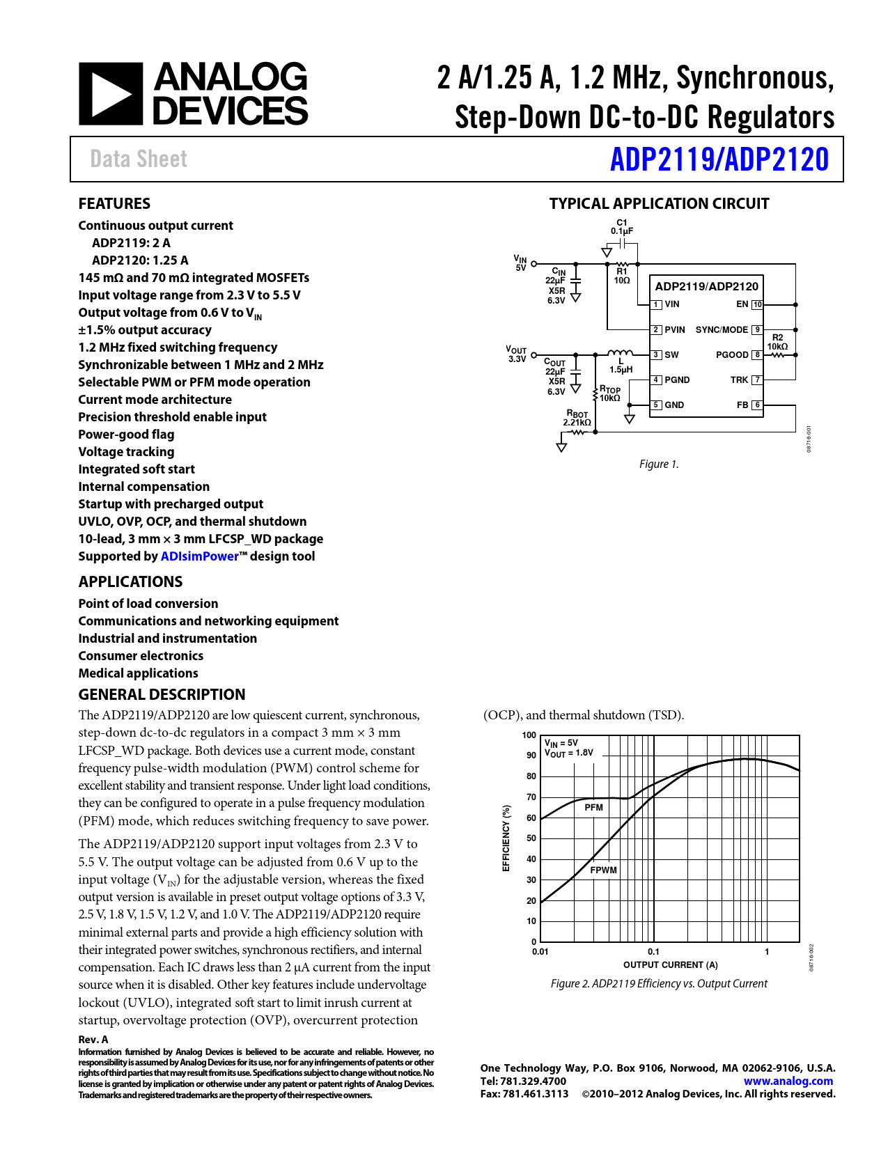 2 A/1.25 A, 1.2 MHz, Synchronous,. Step-Down DC-to-DC Regulators. Data Sheet. ADP2119. /ADP2120. FEATURES