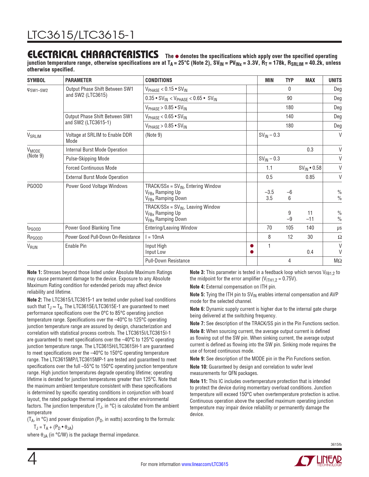 The LTC3615/LTC3615-1 are tested under pulsed load conditions mode for the selected channel. such that TJ ≈ TA. The LTC3615E/LTC3615E-1 are guaranteed to meet