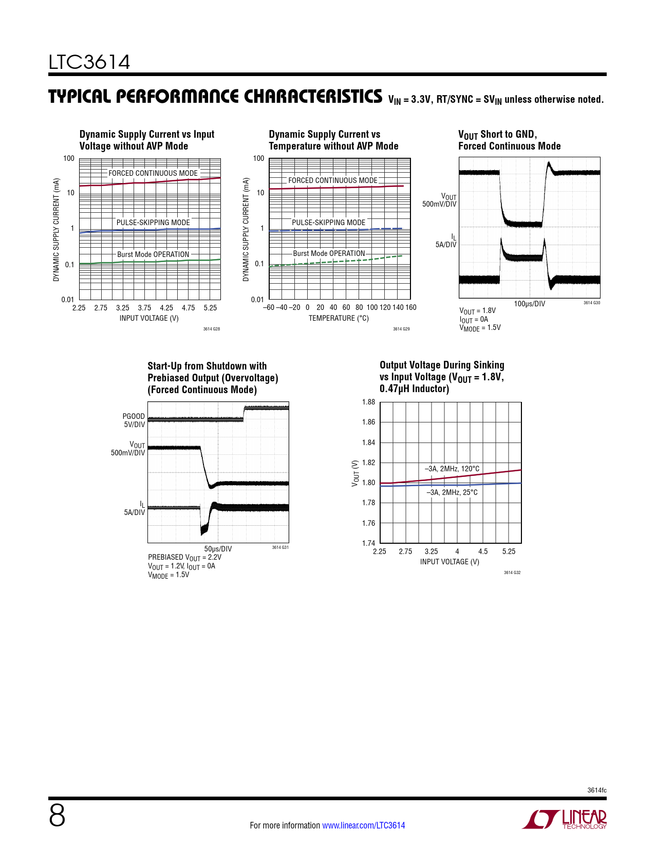 1.88 PGOOD 5V/DIV 1.86 VOUT 1.84 500mV/DIV 1.82 (V) –3A, 2MHz, 120°C V OUT 1.80 –3A, 2MHz, 25°C IL 1.78 5A/DIV 1.76 1.74 50µs/DIV 3614 G31 2.25 2.75 3.25 4 4.5 5.25 PREBIASED VOUT = 2.2V V INPUT VOLTAGE (V) OUT = 1.2V, IOUT = 0A VMODE = 1.5V 3614 G32 3614fc 8 For more information www.linear.com/LTC3614 Document Outline Features Description Applications Typical Application Absolute Maximum Ratings Pin Configuration Electrical Characteristics Typical Performance Characteristics Block Diagram Operation Applications Information Package Description Typical Application Related Parts