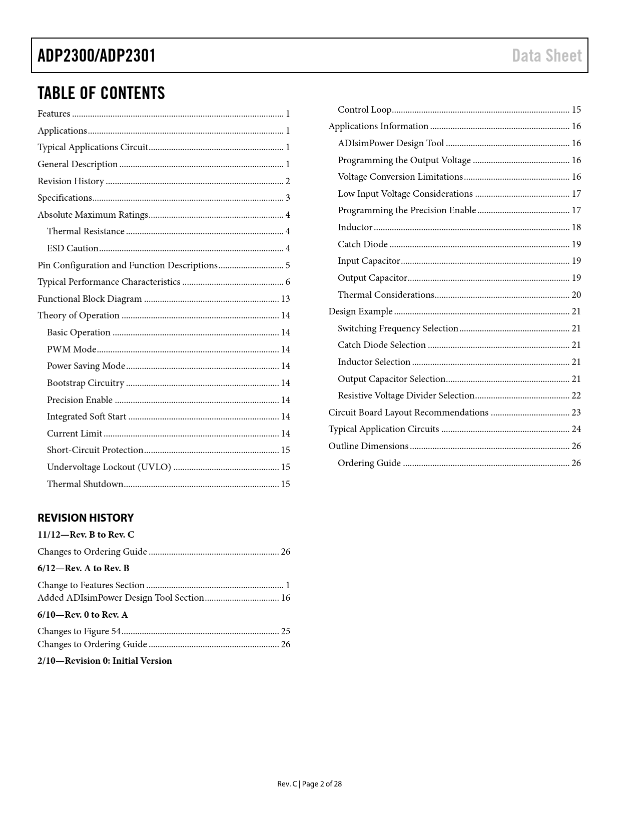 link to page 1 link to page 1 link to page 1 link to page 1 link to page 2 link to page 3 link to page 4 link to page 4 link to page 4 link to page 5 link to page 6 link to page 13 link to page 14 link to page 14 link to page 14 link to page 14 link to page 14 link to page 14 link to page 14 link to page 14 link to page 15 link to page 15 link to page 15 link to page 15 link to page 16 link to page 16 link to page 16 link to page 16 link to page 17 link to page 17 link to page 18 link to page 19 link to page 19 link to page 19 link to page 20 link to page 21 link to page 21 link to page 21 link to page 21 link to page 21 link to page 22 link to page 23 link to page 24 link to page 26 link to page 26 ADP2300/ADP2301Data SheetTABLE OF CONTENTS Features .. 1 Control Loop ... 15 Applications ... 1 Applications Information .. 16 Typical Applications Circuit .. 1 ADIsimPower Design Tool ... 16 General Description ... 1 Programming the Output Voltage ... 16 Revision History ... 2 Voltage Conversion Limitations ... 16 Specifications ... 3 Low Input Voltage Considerations .. 17 Absolute Maximum Ratings .. 4 Programming the Precision Enable ... 17 Thermal Resistance .. 4 Inductor ... 18 ESD Caution .. 4 Catch Diode .. 19 Pin Configuration and Function Descriptions ... 5 Input Capacitor ... 19 Typical Performance Characteristics ... 6 Output Capacitor .. 19 Functional Block Diagram .. 13 Thermal Considerations .. 20 Theory of Operation .. 14 Design Example .. 21 Basic Operation .. 14 Switching Frequency Selection ... 21 PWM Mode ... 14 Catch Diode Selection ... 21 Power Saving Mode .. 14 Inductor Selection .. 21 Bootstrap Circuitry .. 14 Output Capacitor Selection... 21 Precision Enable ... 14 Resistive Voltage Divider Selection .. 22 Integrated Soft Start ... 14 Circuit Board Layout Recommendations ... 23 Current Limit .. 14 Typical Application Circuits ... 24 Short-Circuit Protection .. 15 Outline Dimensions ... 26 Undervoltage Lockout (UVLO) ... 15 Ordering Guide .. 26 Thermal Shutdown ... 15 REVISION HISTORY 11/12—Rev. B to Rev. C Changes to Ordering Guide .. 26 6/12—Rev. A to Rev. B Change to Features Section ... 1 Added ADIsimPower Design Tool Section ... 16 6/10—Rev. 0 to Rev. A Changes to Figure 54 .. 25 Changes to Ordering Guide .. 26 2/10—Revision 0: Initial Version Rev. C | Page 2 of 28 Document Outline Features Applications Typical Applications Circuit General Description Revision History Specifications Absolute Maximum Ratings Thermal Resistance ESD Caution Pin Configuration and Function Descriptions Typical Performance Characteristics Functional Block Diagram Theory of Operation Basic Operation PWM Mode Power Saving Mode Bootstrap Circuitry Precision Enable Integrated Soft Start Current Limit Short-Circuit Protection Undervoltage Lockout (UVLO) Thermal Shutdown Control Loop Applications Information ADIsimPower Design Tool Programming the Output Voltage Voltage Conversion Limitations Low Input Voltage Considerations Programming the Precision Enable Inductor Catch Diode Input Capacitor Output Capacitor Thermal Considerations Design Example Switching Frequency Selection Catch Diode Selection Inductor Selection Output Capacitor Selection Resistive Voltage Divider Selection Circuit Board Layout Recommendations Typical Application Circuits Outline Dimensions Ordering Guide