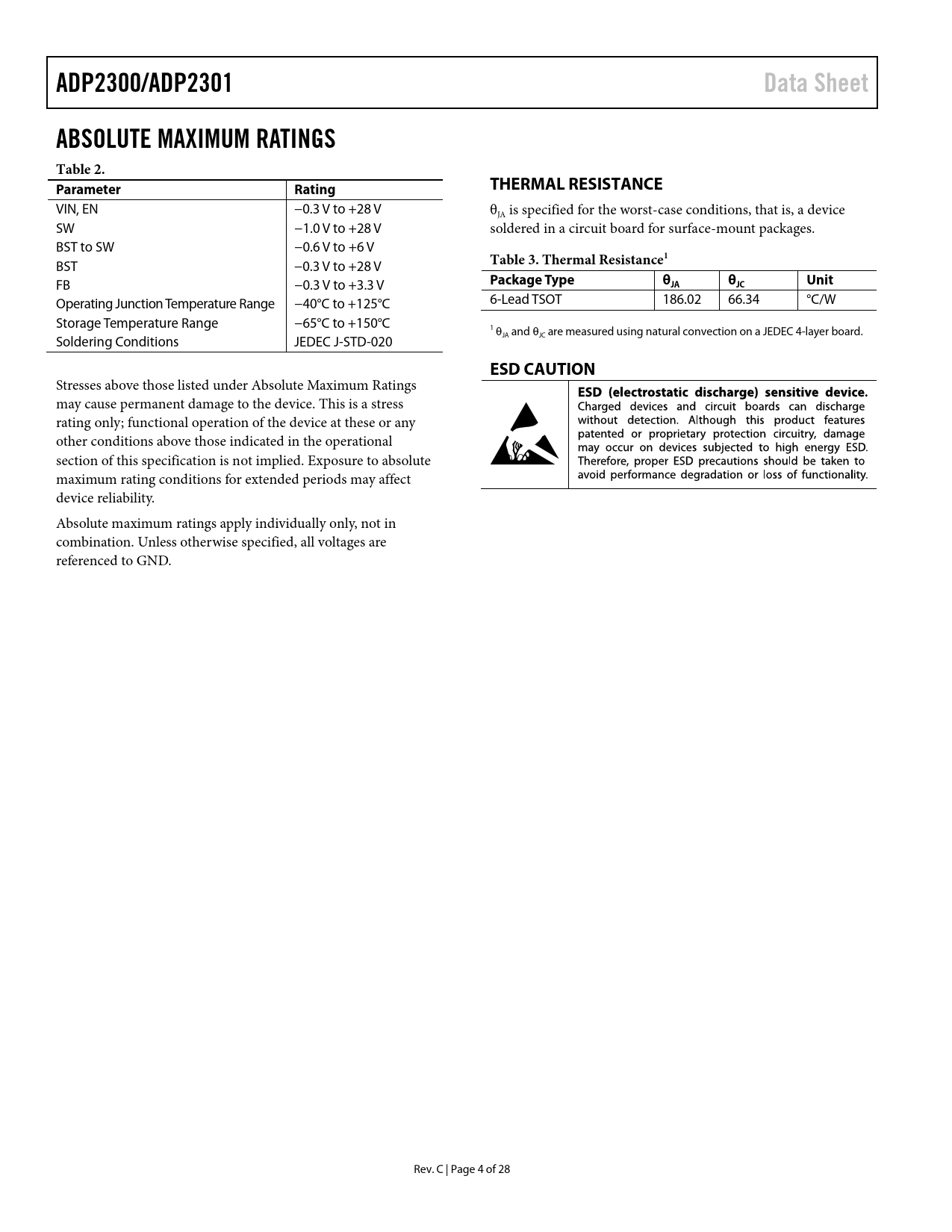 ADP2300/ADP2301 Data Sheet ABSOLUTE MAXIMUM RATINGS Table 2 Parameter Rating THERMAL RESISTANCE Table 3 Thermal Resistance1