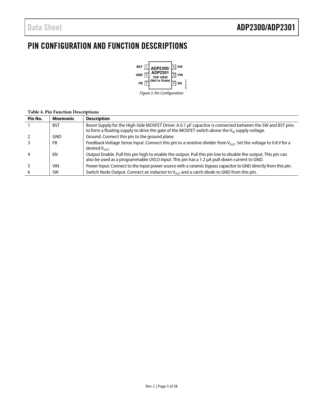 Data SheetADP2300/ADP2301PIN CONFIGURATION AND FUNCTION DESCRIPTIONSBST1ADP2300/ 6 SWADP2301GND25VINTOP VIEW(Not to Scale) 002 FB34EN 08342- Figure 3. Pin Configuration Table 4. Pin Function Descriptions Pin No.MnemonicDescription 1 BST Boost Supply for the High-Side MOSFET Driver. A 0.1 µF capacitor is connected between the SW and BST pins to form a floating supply to drive the gate of the MOSFET switch above the V supply voltage. IN 2 GND Ground. Connect this pin to the ground plane. 3 FB Feedback Voltage Sense Input. Connect this pin to a resistive divider from V . Set the voltage to 0.8 V for a OUT desired V . OUT 4 EN Output Enable. Pull this pin high to enable the output. Pull this pin low to disable the output. This pin can also be used as a programmable UVLO input. This pin has a 1.2 µA pull-down current to GND. 5 VIN Power Input. Connect to the input power source with a ceramic bypass capacitor to GND directly from this pin. 6 SW Switch Node Output. Connect an inductor to V and a catch diode to GND from this pin. OUT Rev. C | Page 5 of 28 Document Outline Features Applications Typical Applications Circuit General Description Revision History Specifications Absolute Maximum Ratings Thermal Resistance ESD Caution Pin Configuration and Function Descriptions Typical Performance Characteristics Functional Block Diagram Theory of Operation Basic Operation PWM Mode Power Saving Mode Bootstrap Circuitry Precision Enable Integrated Soft Start Current Limit Short-Circuit Protection Undervoltage Lockout (UVLO) Thermal Shutdown Control Loop Applications Information ADIsimPower Design Tool Programming the Output Voltage Voltage Conversion Limitations Low Input Voltage Considerations Programming the Precision Enable Inductor Catch Diode Input Capacitor Output Capacitor Thermal Considerations Design Example Switching Frequency Selection Catch Diode Selection Inductor Selection Output Capacitor Selection Resistive Voltage Divider Selection Circuit Board Layout Recommendations Typical Application Circuits Outline Dimensions Ordering Guide