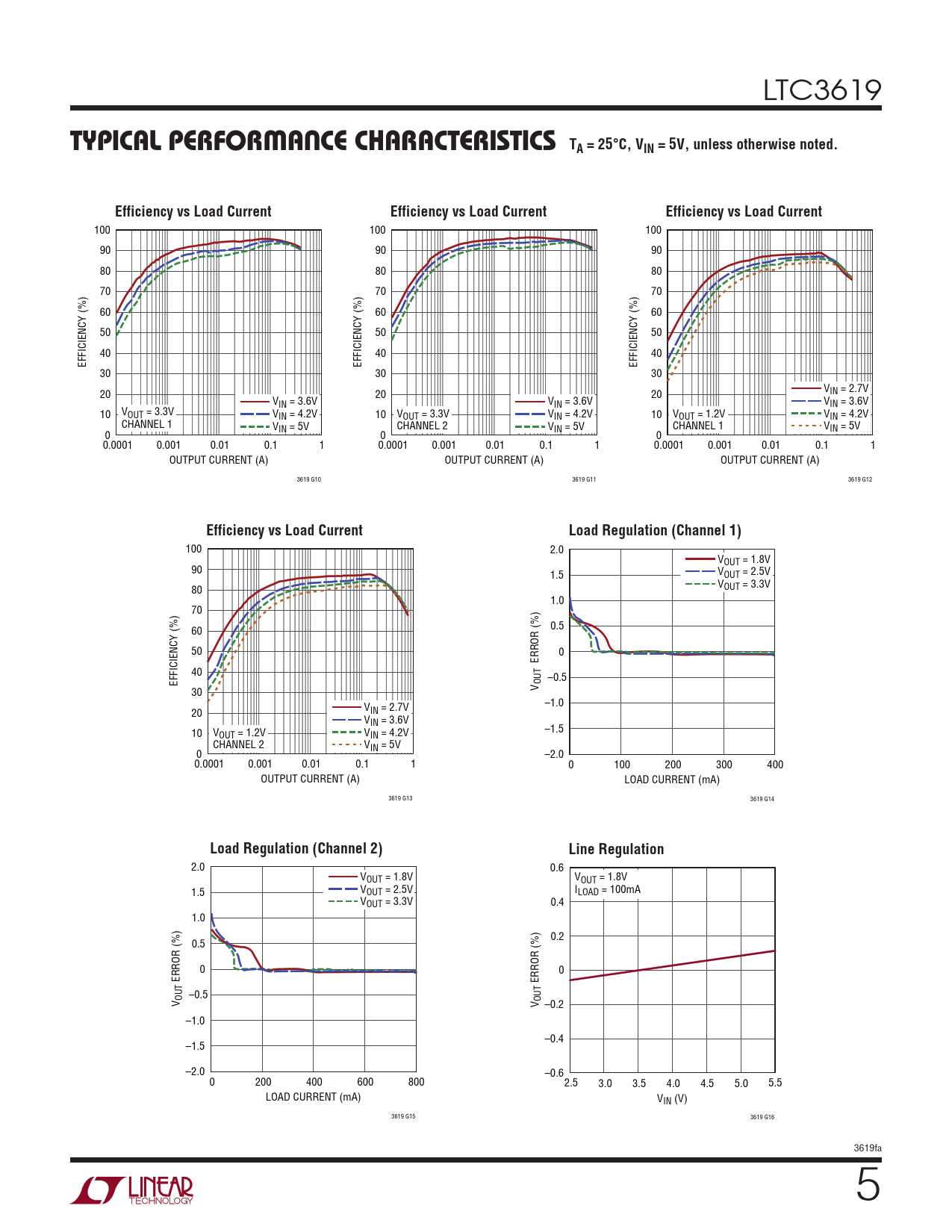100 2.0 VOUT = 1.8V 90 1.5 VOUT = 2.5V 80 VOUT = 3.3V 1.0 70 60 0.5 50 0 ERROR (%) 40 EFFICIENCY (%) –0.5 30 V OUT –1.0 20 VIN = 2.7V VIN = 3.6V 10 V –1.5 OUT = 1.2V VIN = 4.2V CHANNEL 2 V 0 IN = 5V –2.0 0.0001 0.001 0.01 0.1 1 0 100 200 300 400 OUTPUT CURRENT (A) LOAD CURRENT (mA) 3619 G13 3619 G14