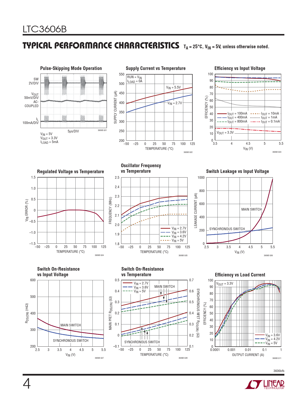 1.5 2.5 1000 1.0 2.4 800 2.3 0.5 600 2.2 0 MAIN SWITCH ERROR (%) 2.1 FB 400 V –0.5 FREQUENCY (MHz) 2.0 V LEAKAGE CURRENT (pA) IN = 2.7V 200 SYNCHRONOUS SWITCH –1.0 V 1.9 IN = 3.6V VIN = 4.2V VIN = 5V –1.5 1.8 0 –50 –25 0 25 50 75 100 125 –50 –25 0 25 50 75 100 125 2.5 3 3.5 4 4.5 5 5.5 TEMPERATURE (°C) TEMPERATURE (°C) VIN (V) 3606B G04 3606B G05 3606B G06