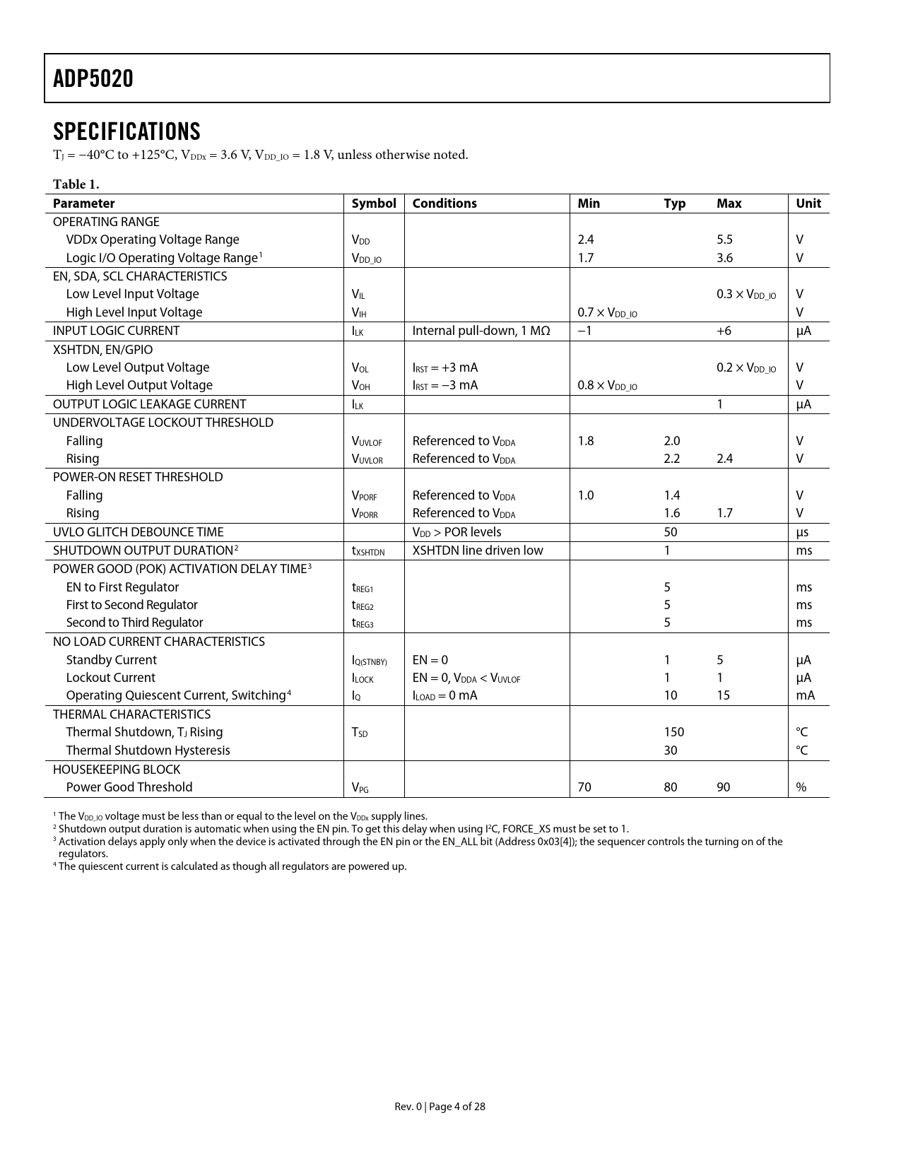 Seiten / Seite28 / 4 — ADP5020. SPECIFICATIONS. Table 1. Parameter Symbol. Conditions. Min. Typ. …