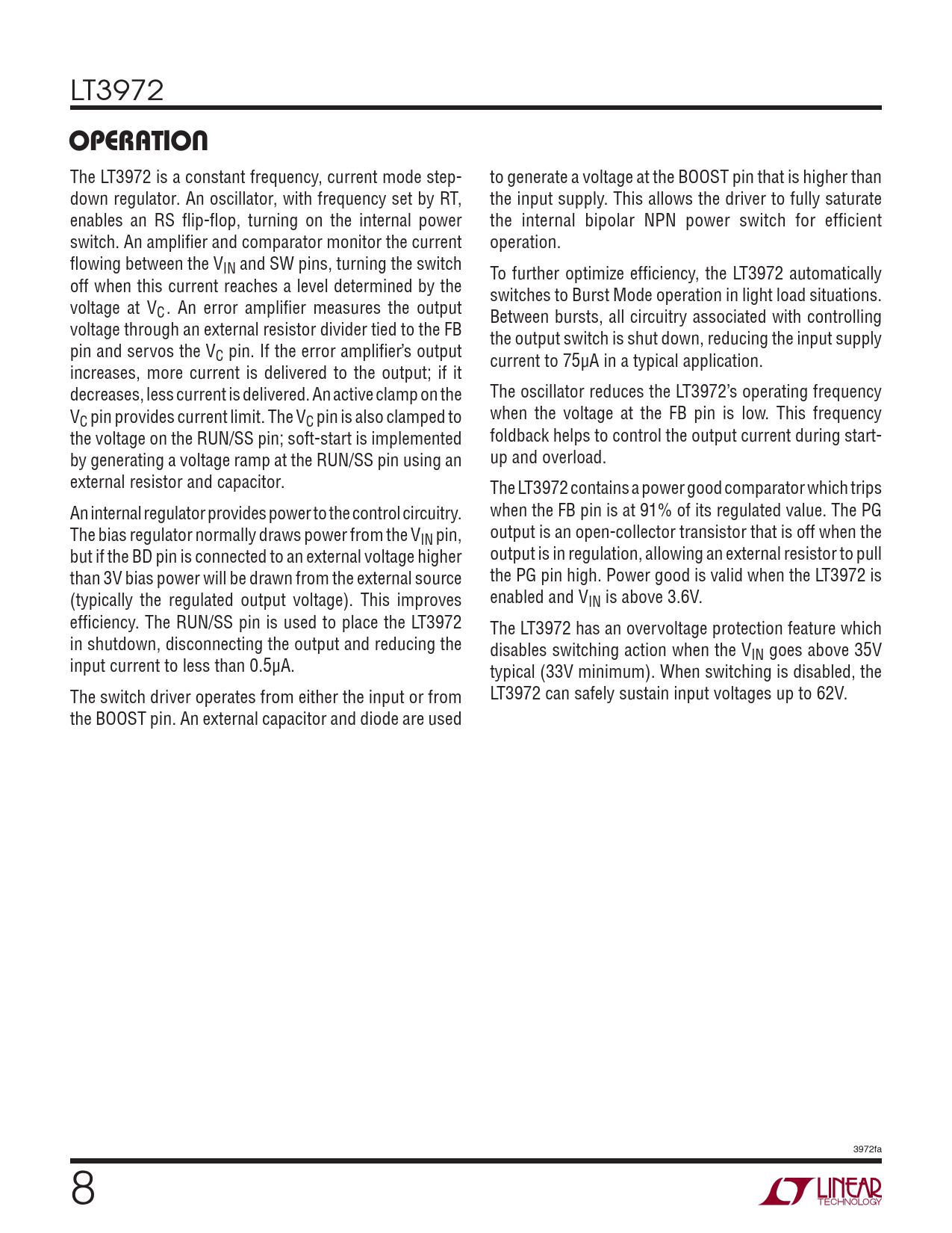 The LT3972 is a constant frequency, current mode step- to generate a voltage at the BOOST pin that is higher than down regulator. An oscillator, with frequency set by RT, the input supply. This allows the driver to fully saturate enables an RS fl ip-fl op, turning on the internal power the internal bipolar NPN power switch for effi cient switch. An amplifi er and comparator monitor the current operation. fl owing between the VIN and SW pins, turning the switch To further optimize effi ciency, the LT3972 automatically off when this current reaches a level determined by the switches to Burst Mode operation in light load situations. voltage at VC. An error amplifi er measures the output Between bursts, all circuitry associated with controlling voltage through an external resistor divider tied to the FB the output switch is shut down, reducing the input supply pin and servos the VC pin. If the error amplifi er’s output current to 75μA in a typical application. increases, more current is delivered to the output; if it decreases, less current is delivered. An active clamp on the The oscillator reduces the LT3972’s operating frequency V when the voltage at the FB pin is low. This frequency C pin provides current limit. The VC pin is also clamped to the voltage on the RUN/SS pin; soft-start is implemented foldback helps to control the output current during start- by generating a voltage ramp at the RUN/SS pin using an up and overload. external resistor and capacitor. The LT3972 contains a power good comparator which trips An internal regulator provides power to the control circuitry. when the FB pin is at 91% of its regulated value. The PG The bias regulator normally draws power from the V output is an open-collector transistor that is off when the IN pin, but if the BD pin is connected to an external voltage higher output is in regulation, allowing an external resistor to pull than 3V bias power will be drawn from the external source the PG pin high. Power good is valid when the LT3972 is (typically the regulated output voltage). This improves enabled and VIN is above 3.6V. effi ciency. The RUN/SS pin is used to place the LT3972 The LT3972 has an overvoltage protection feature which in shutdown, disconnecting the output and reducing the disables switching action when the VIN goes above 35V input current to less than 0.5μA. typical (33V minimum). When switching is disabled, the The switch driver operates from either the input or from LT3972 can safely sustain input voltages up to 62V. the BOOST pin. An external capacitor and diode are used 3972fa 8