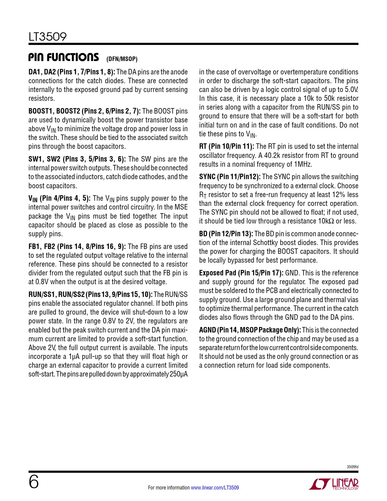 pin FuncTions (DFN/MSOP). DA1, DA2 (Pins 1, 7/Pins 1, 8):. BOOST1, BOOST2 (Pins 2, 6/Pins 2, 7):. RT (Pin 10/Pin 11):