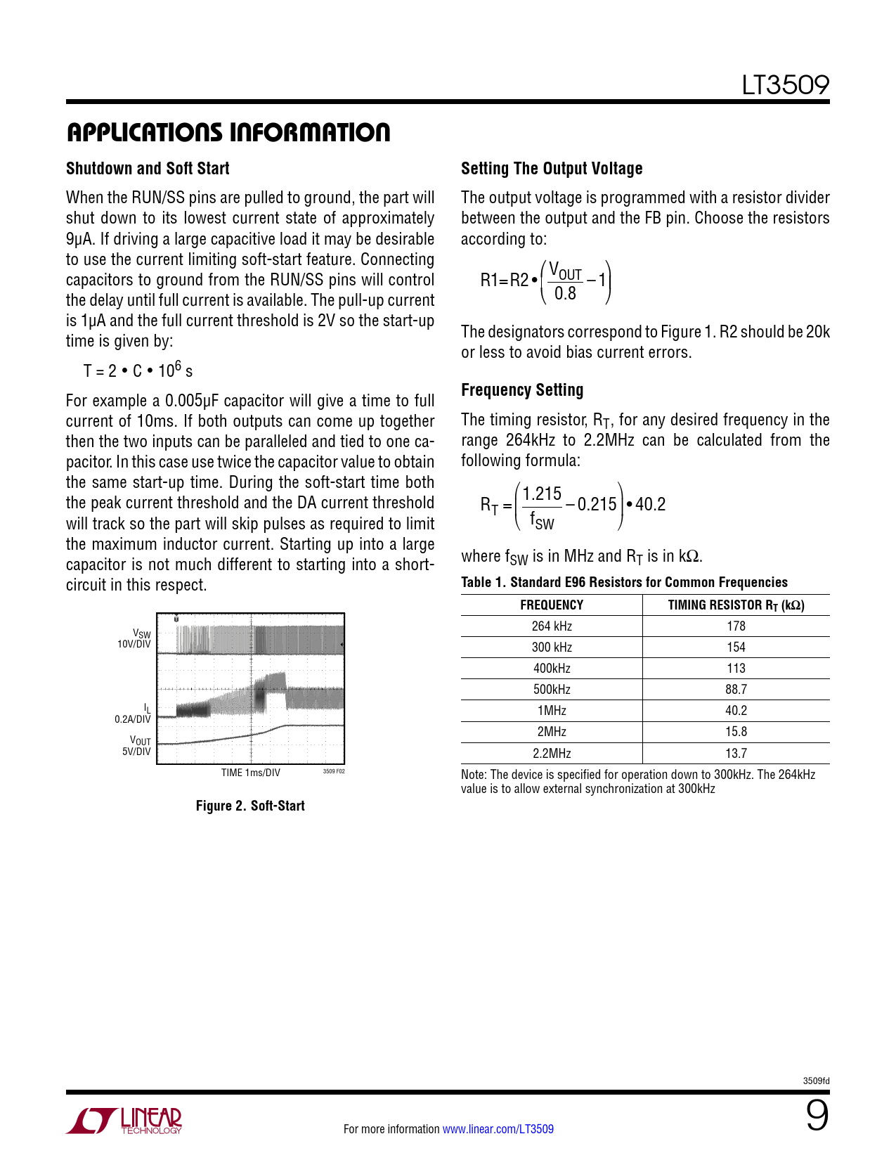 LT3509 applicaTions inForMaTionShutdown and Soft StartSetting The Output Voltage When the RUN/SS pins are pulled to ground, the part will The output voltage is programmed with a resistor divider shut down to its lowest current state of approximately between the output and the FB pin. Choose the resistors 9µA. If driving a large capacitive load it may be desirable according to: to use the current limiting soft-start feature. Connecting capacitors to ground from the RUN/SS pins will control V R1=R2 • OUT – 1 the delay until full current is available. The pull-up current 0.8 is 1µA and the full current threshold is 2V so the start-up time is given by: The designators correspond to Figure 1. R2 should be 20k or less to avoid bias current errors. T = 2 • C • 106 s For example a 0.005µF capacitor will give a time to full Frequency Setting current of 10ms. If both outputs can come up together The timing resistor, RT , for any desired frequency in the then the two inputs can be paralleled and tied to one ca- range 264kHz to 2.2MHz can be calculated from the pacitor. In this case use twice the capacitor value to obtain following formula: the same start-up time. During the soft-start time both the peak current threshold and the DA current threshold R 1.215 T = – 0.215 • 40.2 will track so the part will skip pulses as required to limit fSW the maximum inductor current. Starting up into a large capacitor is not much different to starting into a short- where fSW is in MHz and RT is in kΩ. circuit in this respect. Table 1. Standard E96 Resistors for Common FrequenciesFREQUENCYTIMING RESISTOR RT (kΩ) 264 kHz 178 VSW 10V/DIV 300 kHz 154 400kHz 113 500kHz 88.7 IL 1MHz 40.2 0.2A/DIV 2MHz 15.8 VOUT 5V/DIV 2.2MHz 13.7 TIME 1ms/DIV 3509 F02 Note: The device is specified for operation down to 300kHz. The 264kHz value is to allow external synchronization at 300kHz Figure 2. Soft-Start 3509fd For more information www.linear.com/LT3509 9 Document Outline Features Description Applications Typical Application Absolute Maximum Ratings Electrical Characteristics Typical Performance Characteristics Pin Functions Block Diagram Operation Related Parts