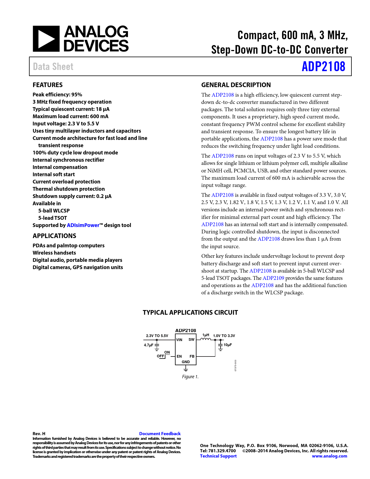 Compact, 600 mA, 3 MHz,. Step-Down DC-to-DC Converter. Data Sheet. ADP2108. FEATURES. GENERAL DESCRIPTION. Peak efficiency: 95%