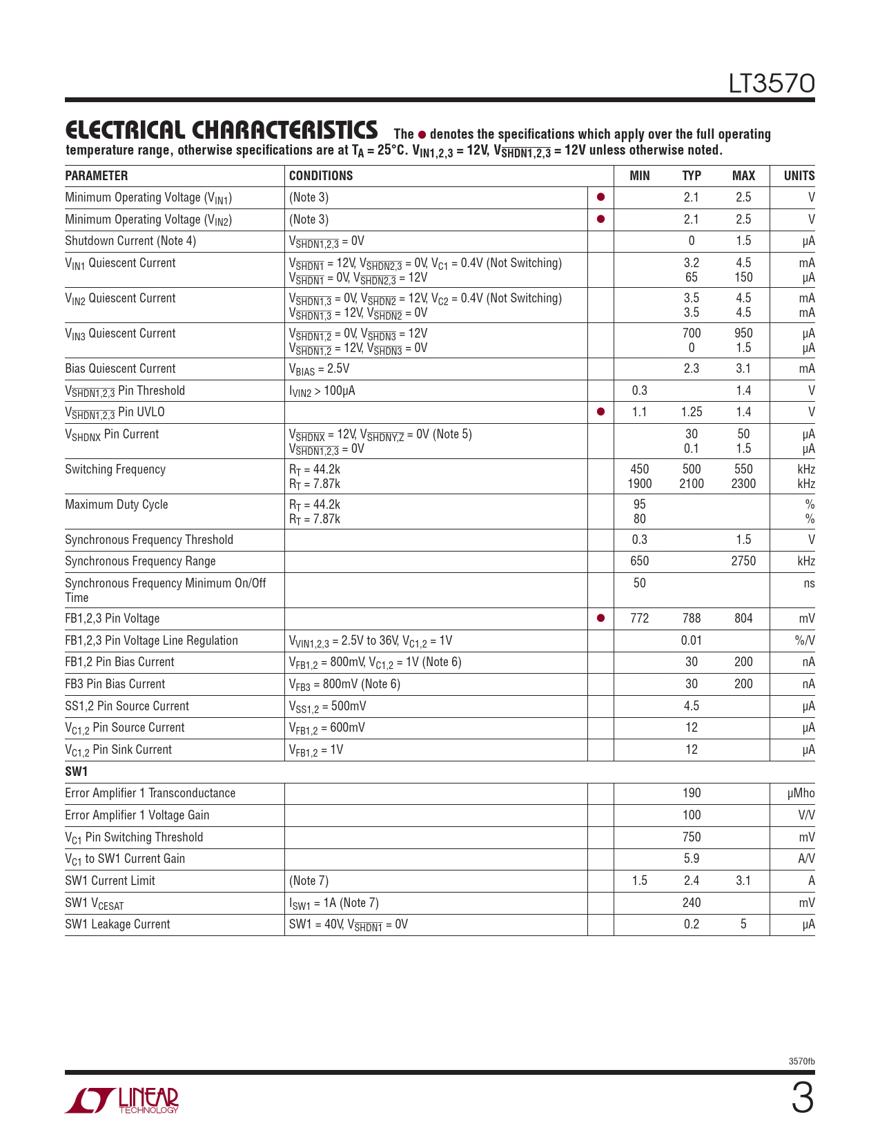Minimum Operating Voltage (VIN1) (Note 3) l 2.1 2.5 V Minimum Operating Voltage (VIN2) (Note 3) l 2.1 2.5 V Shutdown Current (Note 4) VSHDN1,2,3 = 0V 0 1.5 μA VIN1 Quiescent Current VSHDN1 = 12V, VSHDN2,3 = 0V, VC1 = 0.4V (Not Switching) 3.2 4.5 mA VSHDN1 = 0V, VSHDN2,3 = 12V 65 150 μA VIN2 Quiescent Current VSHDN1,3 = 0V, VSHDN2 = 12V, VC2 = 0.4V (Not Switching) 3.5 4.5 mA VSHDN1,3 = 12V, VSHDN2 = 0V 3.5 4.5 mA VIN3 Quiescent Current VSHDN1,2 = 0V, VSHDN3 = 12V 700 950 μA VSHDN1,2 = 12V, VSHDN3 = 0V 0 1.5 μA Bias Quiescent Current VBIAS = 2.5V 2.3 3.1 mA VSHDN1,2,3 Pin Threshold IVIN2 > 100μA 0.3 1.4 V VSHDN1,2,3 Pin UVLO l 1.1 1.25 1.4 V VSHDNX Pin Current VSHDNX = 12V, VSHDNY,Z = 0V (Note 5) 30 50 μA VSHDN1,2,3 = 0V 0.1 1.5 μA Switching Frequency RT = 44.2k 450 500 550 kHz RT = 7.87k 1900 2100 2300 kHz Maximum Duty Cycle RT = 44.2k 95 % RT = 7.87k 80 % Synchronous Frequency Threshold 0.3 1.5 V Synchronous Frequency Range 650 2750 kHz Synchronous Frequency Minimum On/Off 50 ns Time FB1,2,3 Pin Voltage l 772 788 804 mV FB1,2,3 Pin Voltage Line Regulation VVIN1,2,3 = 2.5V to 36V, VC1,2 = 1V 0.01 %/V FB1,2 Pin Bias Current VFB1,2 = 800mV, VC1,2 = 1V (Note 6) 30 200 nA FB3 Pin Bias Current VFB3 = 800mV (Note 6) 30 200 nA SS1,2 Pin Source Current VSS1,2 = 500mV 4.5 μA VC1,2 Pin Source Current VFB1,2 = 600mV 12 μA VC1,2 Pin Sink Current VFB1,2 = 1V 12 μA