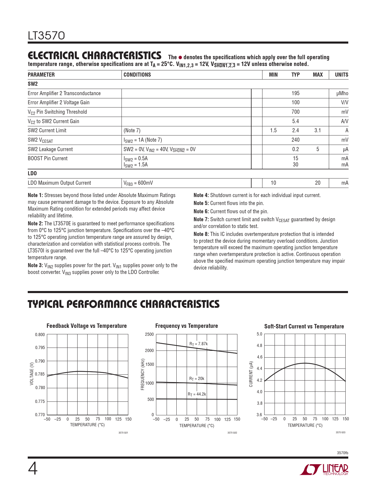 LT3570 ELECTRICAL CHARACTERISTICSThe l denotes the specifi cations which apply over the full operatingtemperature range, otherwise specifi cations are at TA = 25°C. VIN1,2,3 = 12V, VSHDN1,2,3 = 12V unless otherwise noted.PARAMETERCONDITIONSMINTYPMAXUNITSSW2 Error Amplifi er 2 Transconductance 195 μMho Error Amplifi er 2 Voltage Gain 100 V/V VC2 Pin Switching Threshold 700 mV VC2 to SW2 Current Gain 5.4 A/V SW2 Current Limit (Note 7) 1.5 2.4 3.1 A SW2 VCESAT ISW2 = 1A (Note 7) 240 mV SW2 Leakage Current SW2 = 0V, VIN2 = 40V, VSHDN2 = 0V 0.2 5 μA BOOST Pin Current ISW2 = 0.5A 15 mA ISW2 = 1.5A 30 mA LDO LDO Maximum Output Current VFB3 = 600mV 10 20 mA Note 1: Stresses beyond those listed under Absolute Maximum Ratings Note 4: Shutdown current is for each individual input current. may cause permanent damage to the device. Exposure to any Absolute Note 5: Current fl ows into the pin. Maximum Rating condition for extended periods may affect device Note 6: Current fl ows out of the pin. reliability and lifetime. Note 7: Switch current limit and switch VCESAT guaranteed by design Note 2: The LT3570E is guaranteed to meet performance specifi cations and/or correlation to static test. from 0°C to 125°C junction temperature. Specifi cations over the –40°C Note 8: This IC includes overtemperature protection that is intended to 125°C operating junction temperature range are assured by design, to protect the device during momentary overload conditions. Junction characterization and correlation with statistical process controls. The temperature will exceed the maximum operating junction temperature LT3570I is guaranteed over the full –40°C to 125°C operating junction range when overtemperature protection is active. Continuous operation temperature range. above the specifi ed maximum operating junction temperature may impair Note 3: VIN2 supplies power for the part. VIN1 supplies power only to the device reliability. boost converter. VIN3 supplies power only to the LDO Controller. TYPICAL PERFORMANCE CHARACTERISTICSFeedback Voltage vs TemperatureFrequency vs TemperatureSoft-Start Current vs Temperature 0.800 2500 5.0 RT = 7.87k 4.8 0.795 2000 4.6 0.790 1500 4.4 0.785 RT = 20k 4.2 VOLTAGE (V) 1000 CURRENT (μA) 0.780 FREQUENCY (kHz) 4.0 RT = 44.2k 500 0.775 3.8 0.770 0 3.6 –50 –25 0 25 50 75 100 125 150 –50 –25 0 25 50 75 100 125 150 –50 –25 0 25 50 75 100 125 150 TEMPERATURE (°C) TEMPERATURE (°C) TEMPERATURE (°C) 3570 G01 3570 G02 3570 G03 3570fb 4