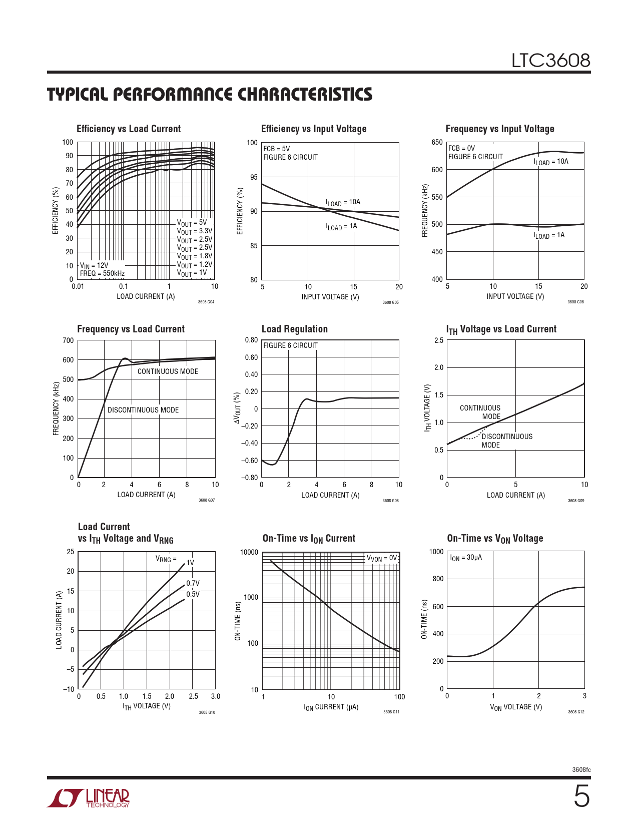 700 0.80 2.5 FIGURE 6 CIRCUIT 0.60 600 2.0 CONTINUOUS MODE 0.40 500 0.20 1.5 400 (%) DISCONTINUOUS MODE 0 TAGE (V) CONTINUOUS 300 V OUT MODE Δ VOL –0.20 1.0 I TH FREQUENCY (kHz) 200 DISCONTINUOUS –0.40 MODE 0.5 100 –0.60 0 –0.80 0 0 2 4 6 8 10 0 2 4 6 8 10 0 5 10 LOAD CURRENT (A) LOAD CURRENT (A) LOAD CURRENT (A) 3608 G07 3608 G08 3608 G09