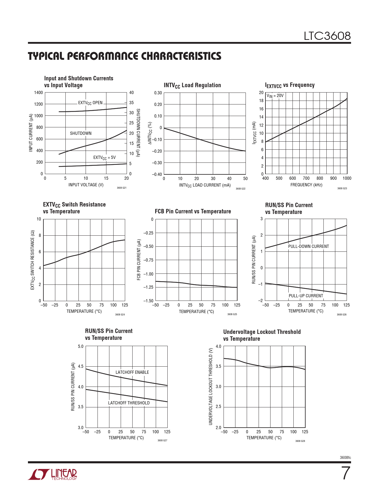 1400 40 0.30 20 VIN = 20V 18 1200 EXTVCC OPEN 35 SHUTDOWN CURRENT (µA) 0.20 16 30 1000 0.10 14 25 800 12 (%) 0 (mA) SHUTDOWN 20 CC 10 600 INTV –0.10 15 Δ I EXTVCC 8 INPUT CURRENT (µA) 400 6 10 –0.20 EXTVCC = 5V 4 200 5 –0.30 2 0 0 –0.40 0 0 5 10 15 20 0 10 20 30 40 50 400 500 600 700 800 900 1000 INPUT VOLTAGE (V) INTVCC LOAD CURRENT (mA) FREQUENCY (kHz) 3608 G21 3608 G22 3608 G23